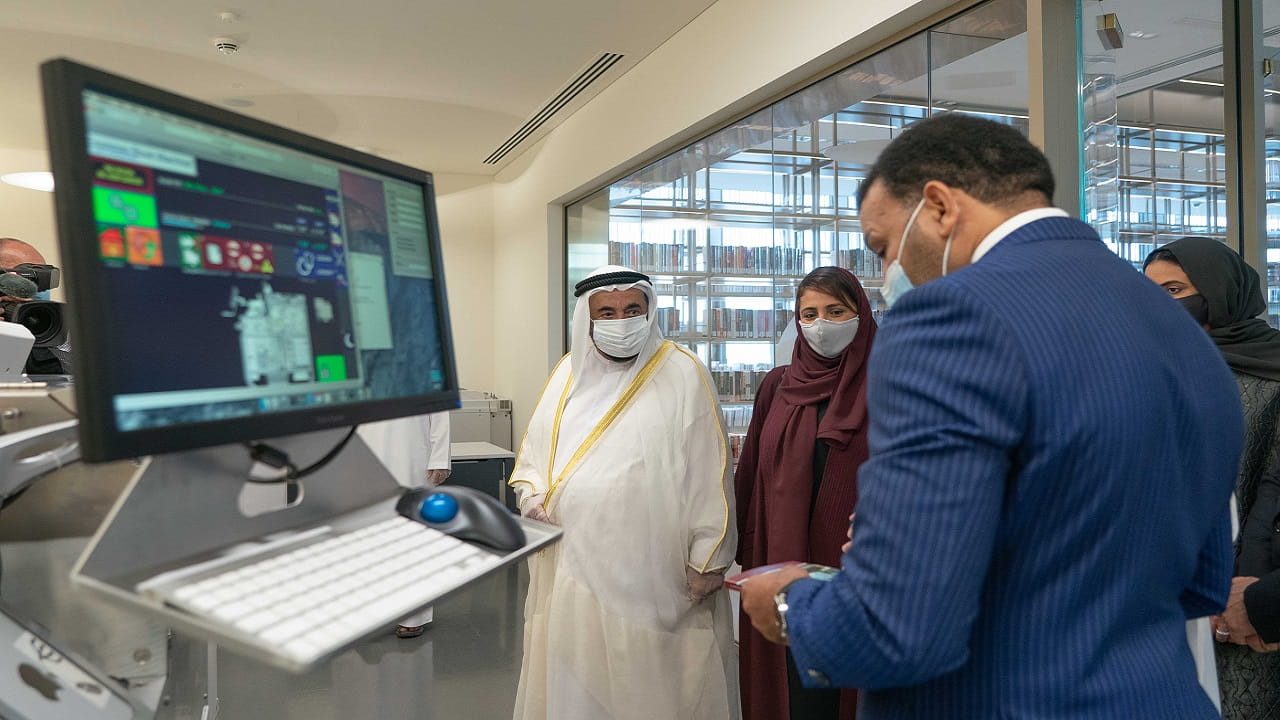 وتجول صاحب السمو حاكم الشارقة في أرجاء المبنى، مستهلاً زيارته بالتوقّف عند المكتبة الضخمة التي يحتضنها "بيت الحكمة"، والتي ستضم 305 آلاف كتاب في مختلف الحقول الثقافية والأدبية والمعرفية منها 11 ألف بلغات مختلفة، ومنها 105 آلاف كتاب ورقي، وما يقرب من 200 ألف كتاب إلكتروني.