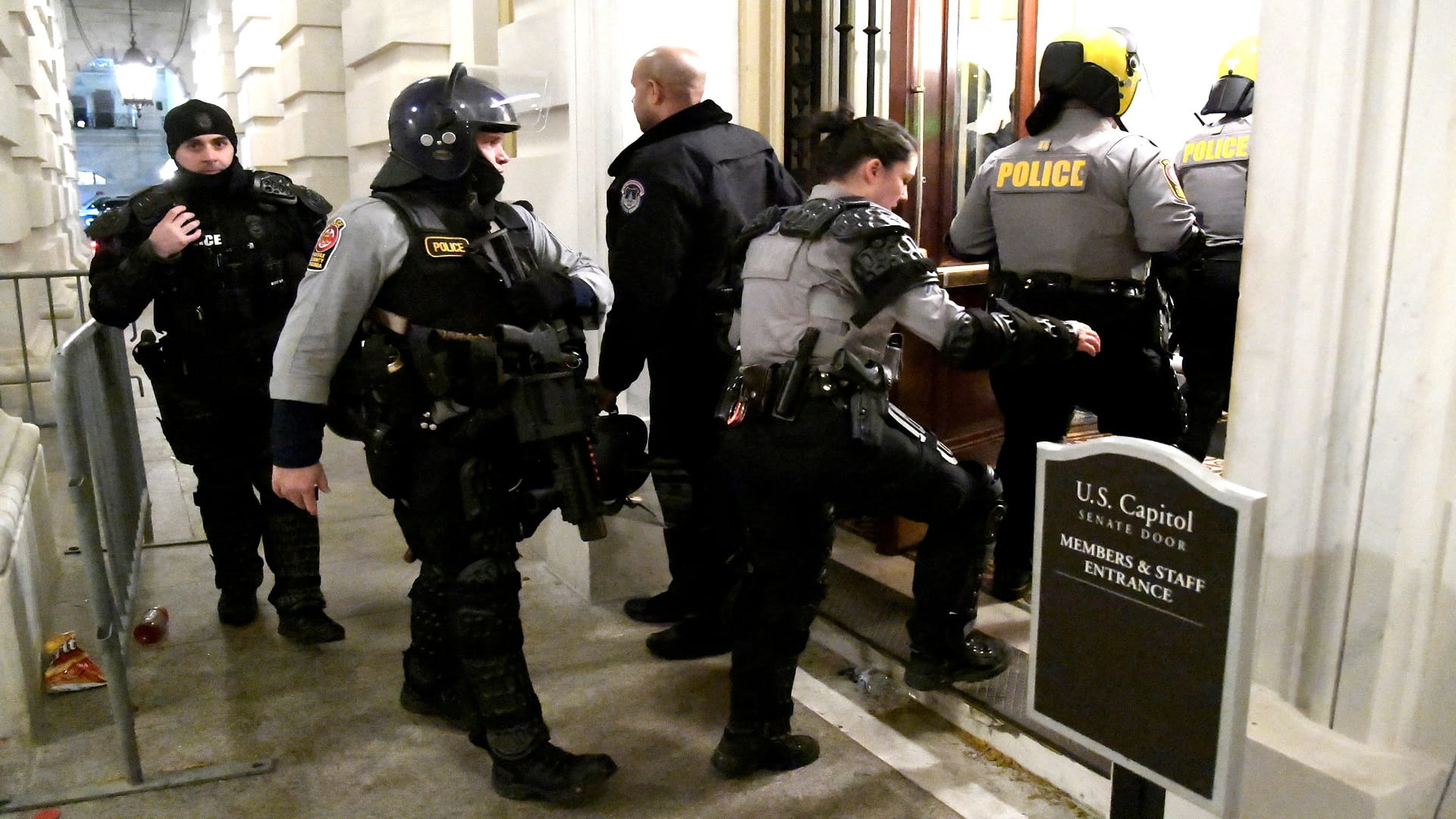 أفراد من شرطة مقاطعة فيرفاكس بولاية فرجينيا يصلون إلى مدخل مجلس الشيوخ في مبنى الكونجرس بواشنطن