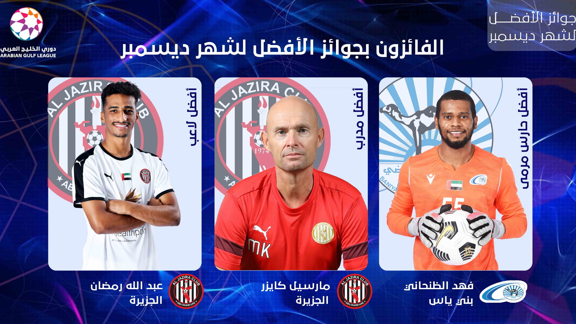 وتوج عبد الله رمضان لاعب وسط الجزيرة بجائزة أفضل لاعب في دوري الخليج العربي لشهر ديسمبر، كما حصد مدربه الهولندي مارسيل كايزر مدرب الجزيرة على جائزة أفضل مدرب، ليكرر الثنائي تفوقهما بعدما فازا بهذه الجائزة في شهر نوفمبر أيضاً.