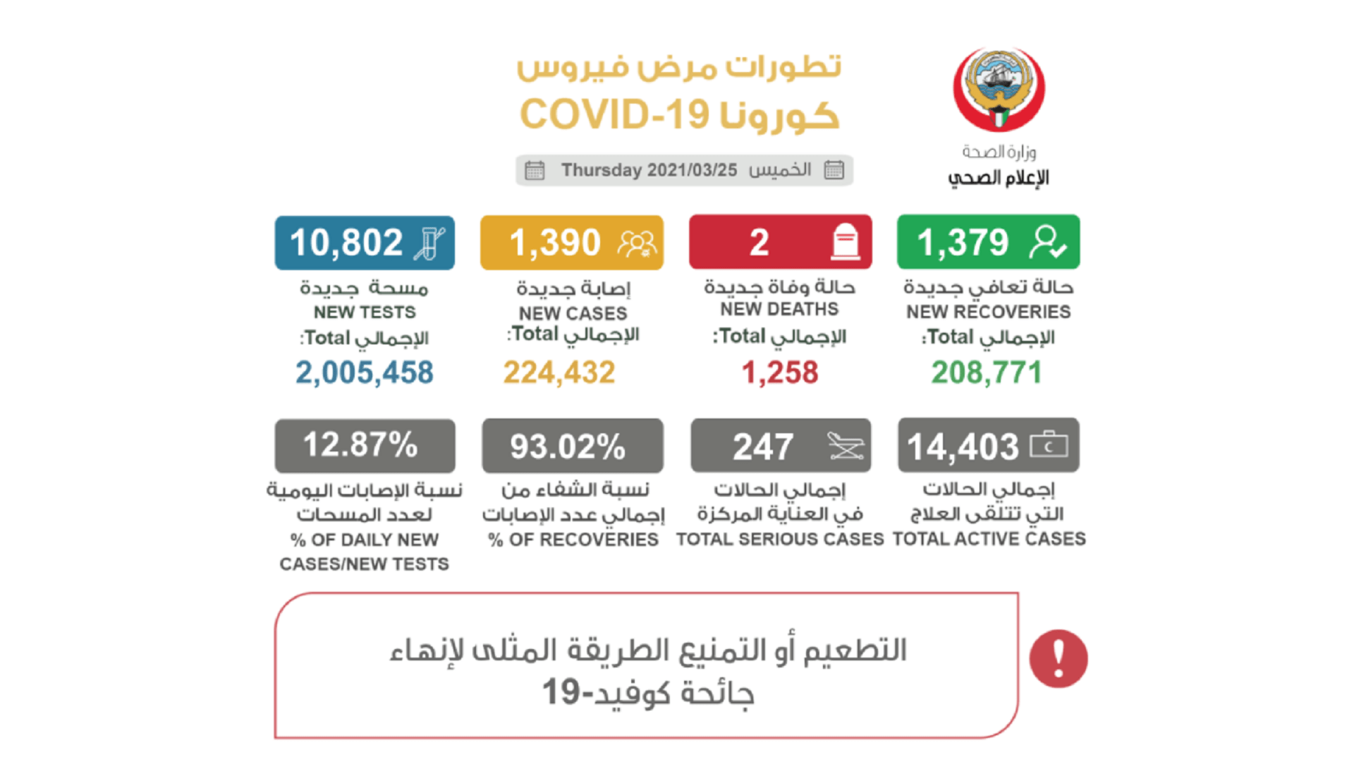 سجلت الكويت 1390 إصابة جديدة بفيروس كورونا المستجد خلال الـ 24 ساعة الماضية، ليرتفع إجمالي الحالات المسجلة إلى 224432 حالة، فيما سجلت حالتي وفاة ليصبح مجموع حالات الوفيات المسجلة حتى الآن 1258 حالة.