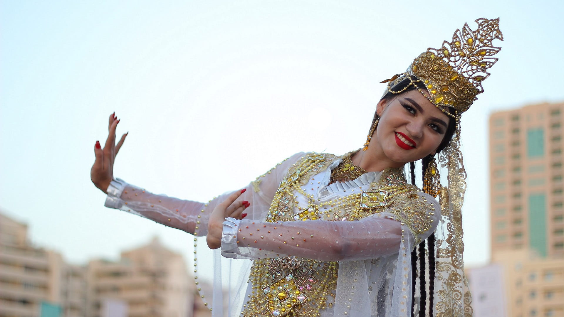 تروي الفتاة الطاجكستانية سيرة استقبال بلادها لفصل الربيع، إذ تنقل برقصتها الشعبية كيف كان أهالي بلادها يحتفلون بـ "عيد النيروز" لزوّار فعاليات الدورة الـ 18 من "أيام الشارقة التراثية".