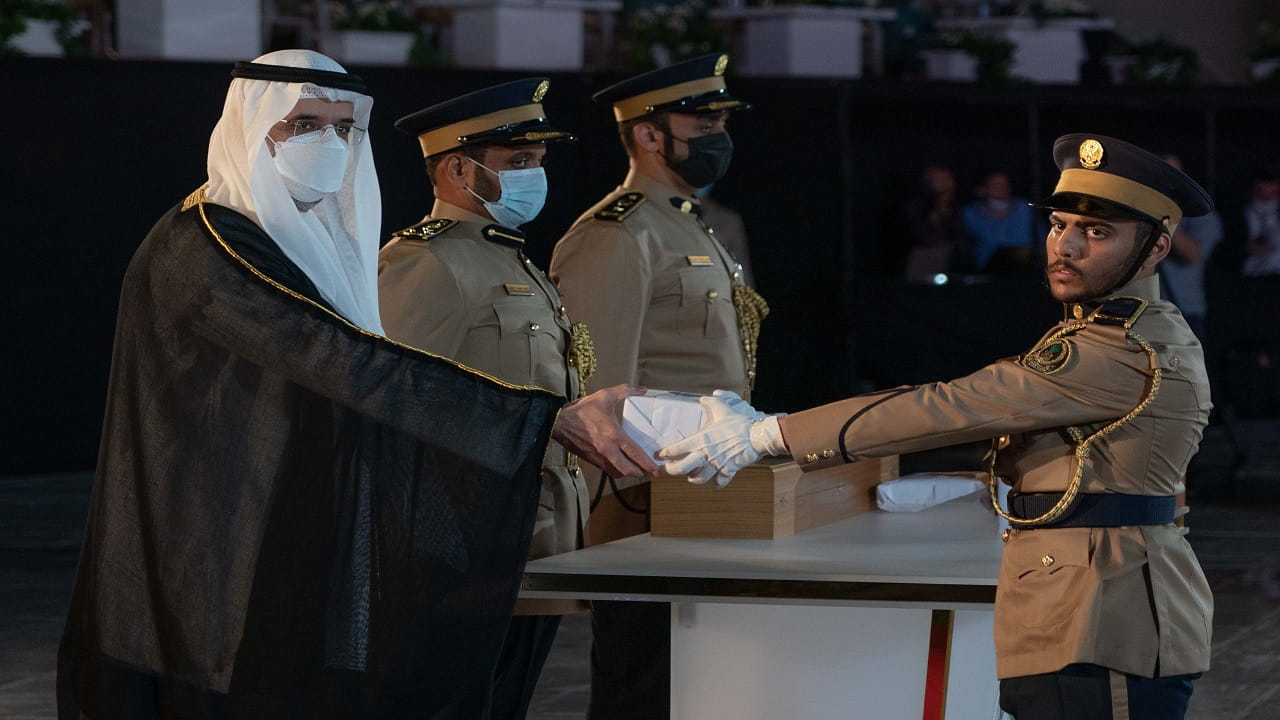 بعدها تفضل سمو الشيخ سلطان بن محمد بن سلطان القاسمي راعي الحفل، بتكريم أوائل الدفعة في عدد من التخصصات العلمية والعملية، متمنياً لهم التوفيق والسداد والمستقبل الزاخر بالنجاح، داعياً إياهم إلى مواصلة التفوق والنجاح، واضعين نصب أعينهم أن أمن الوطن والمواطن هو أمانة في أعناقهم وعليهم الدفاع عنها والتفاني في سبيل الحفاظ عليها، وأن يعملوا بجد واجتهاد لكي يبقى الوطن شامخاً عزيزاً بسواعدهم الفتية.