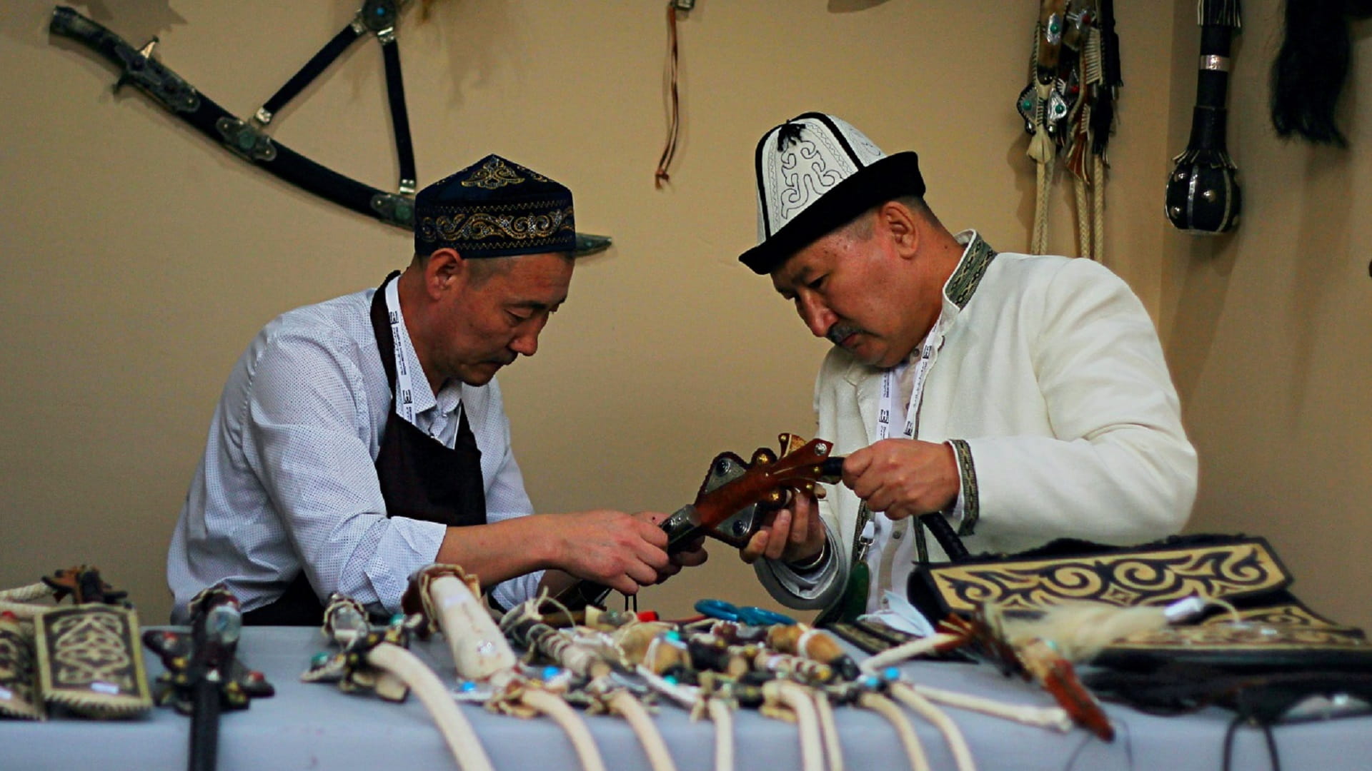 يروي حرفيان من كازاخستان، لزوار "أيام الشارقة التراثية"، كيف كان أجدادهما يصنعون السياط من جلود الحيوانات؟ ويزينونها بالأحجار والنقوش والفضة المزخرفة، إذ يتحول كل سوط بين أيديهم إلى قطعة فنية تعبر عن عناد أهل بلادهم في تطويع الحيوانات الجامحة.