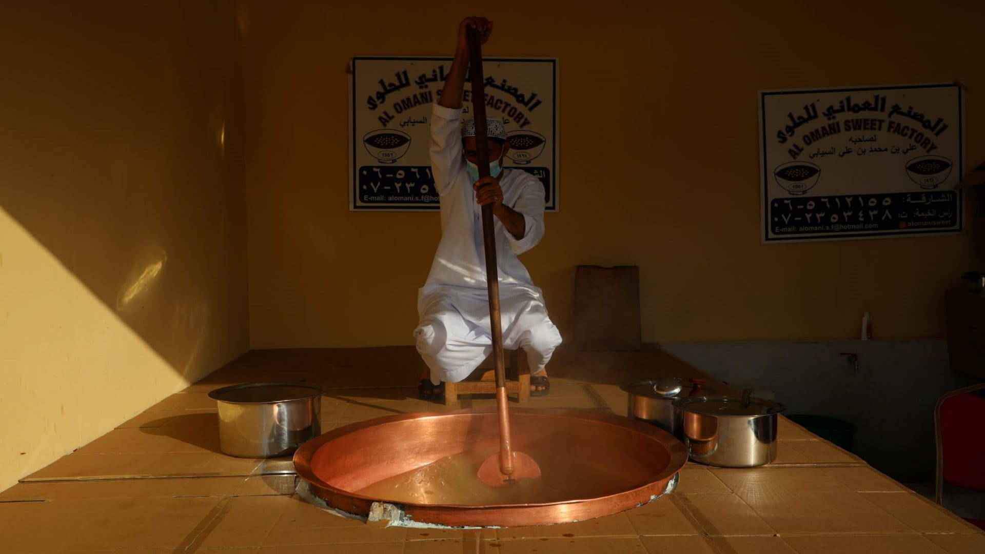 يجلس هذا الرجل بزيّه العماني التقليدي إلى جانب قدر كبير ليعد الحلوى العمانية الشهيرة، إلاّ أنه لا يحركها ويقلبها بهذه المغرفة الضخمة فقط كما يبدو، وإنما يقدم لجمهور "أيام الشارقة التراثية 18" صورة حيّة لتقاليد الضيافة والفرح في عُمان.