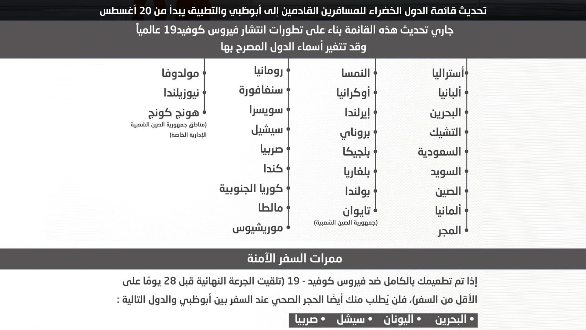 كما سيتم تحديث الدول والأقاليم المدرجة في القائمة بشكل روتيني، بناءً على التطورات العالمية لجائحة "كوفيد-19"، ويتم إدراج أسماء الدول التي تتوافق مع معايير صارمة للأمن والصحة من أجل حماية المجتمع المحلي.