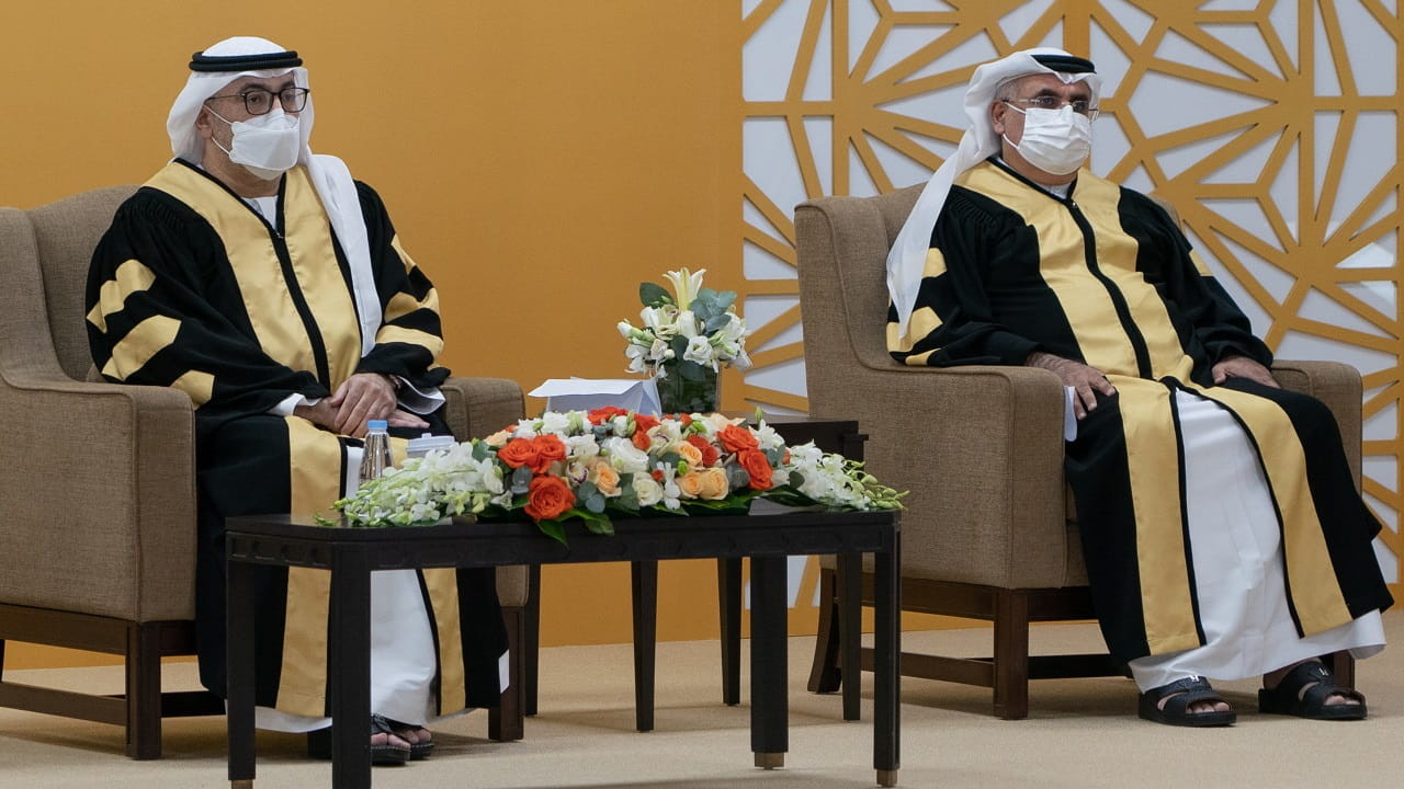 وتفضل صاحب السمو حاكم الشارقة، بتسليم معالي عبد الرحمن بن محمد العويس، والدكتور عارف النورياني شهادات الدكتوراه الفخرية، مهنئاً إياهما هذا الإنجاز وشاكراً لهما جهودهما العظيمة ومتمنياً لهما التوفيق والسداد.