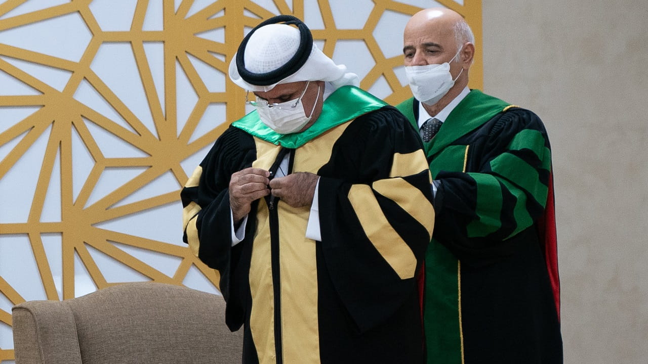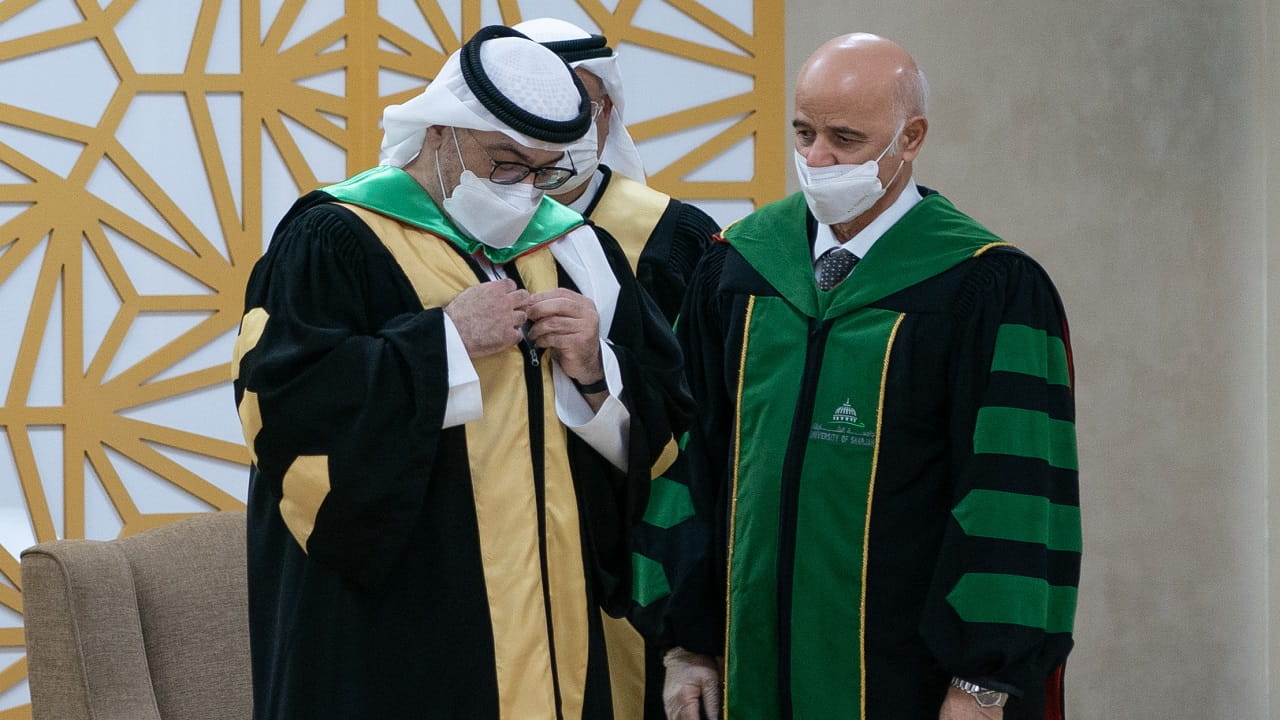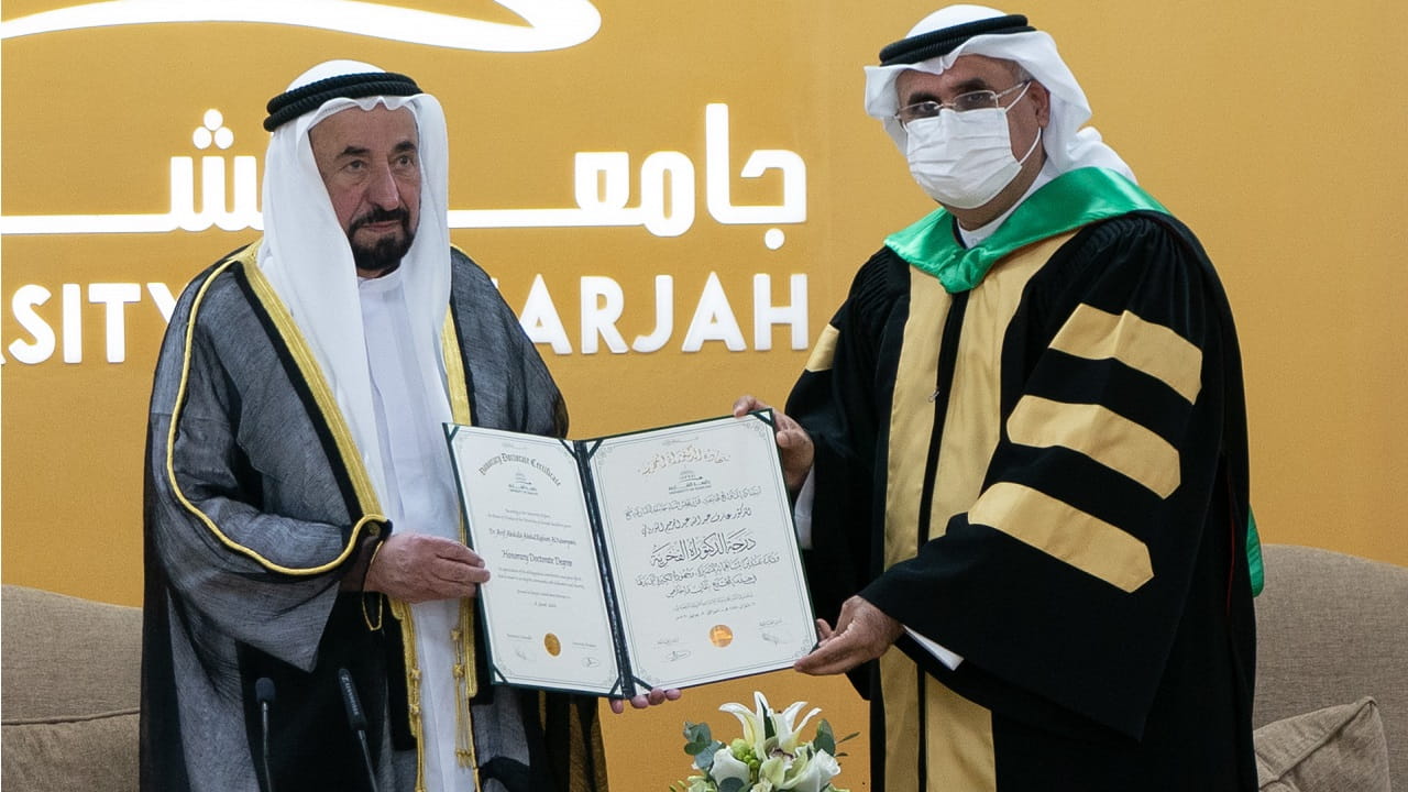 وكانت مراسم تسليم شهادات الدكتوراه الفخرية، تضمنت عرض الحيثيات التي استندت إليها جامعة الشارقة في منح مجلس أمناء الجامعة لشهادات الدكتوراه الفخرية وفقاً للائحة الجامعة، ومنها أن تُمنح لشخصية معروفة ومشهود لها بالتميّز، وتشكل مصدر تقدير وإلهام للمجتمع، والأجيال القادمة، والعاملين في الحقل الأكاديمي، وأن تكون هذه الشخصية قد قدمت إنجازات استثنائية متميّزة في العطاء العلمي أو الاجتماعي أو الاقتصادي أو الإنساني، أو المساهمة وطنياً وعالمياً.