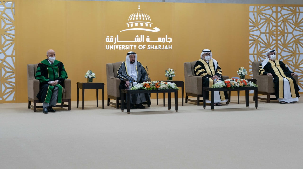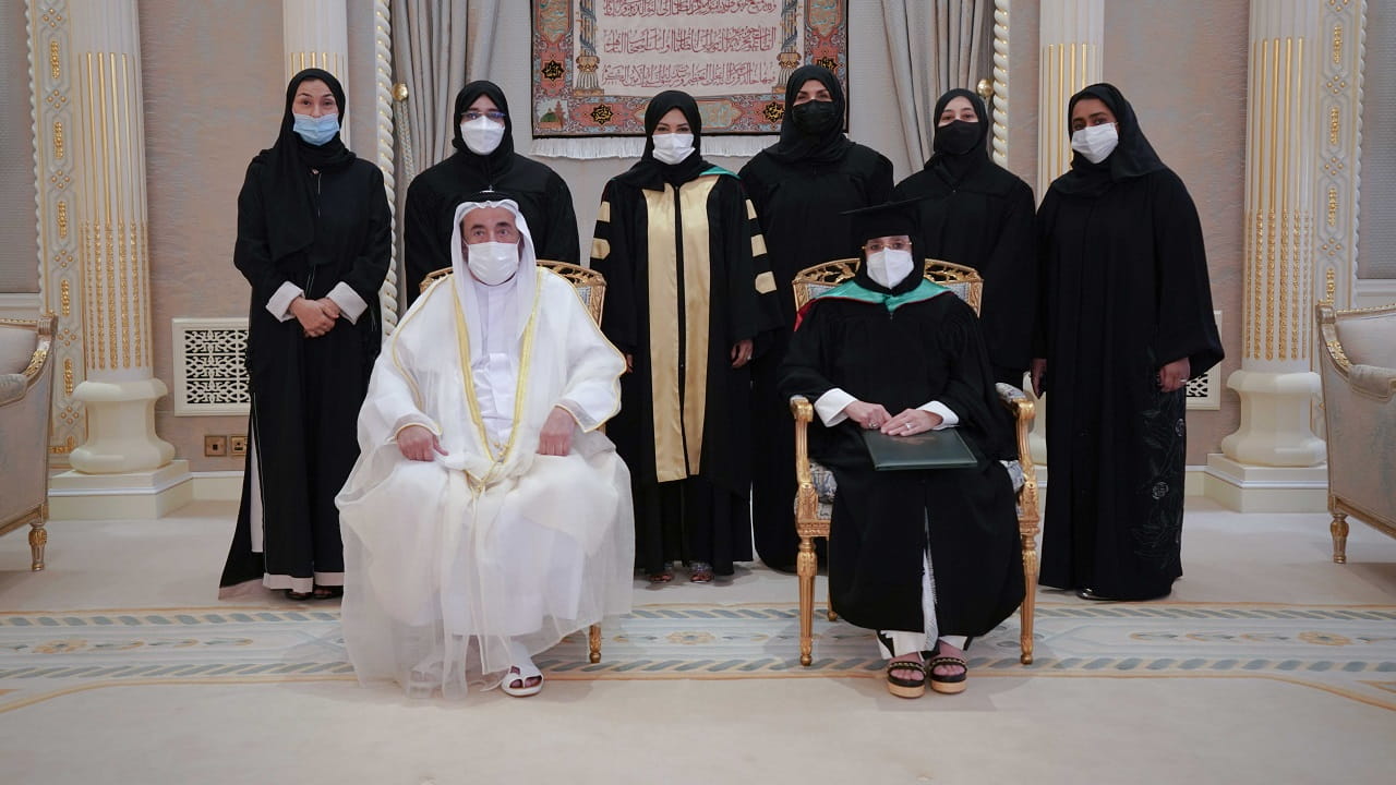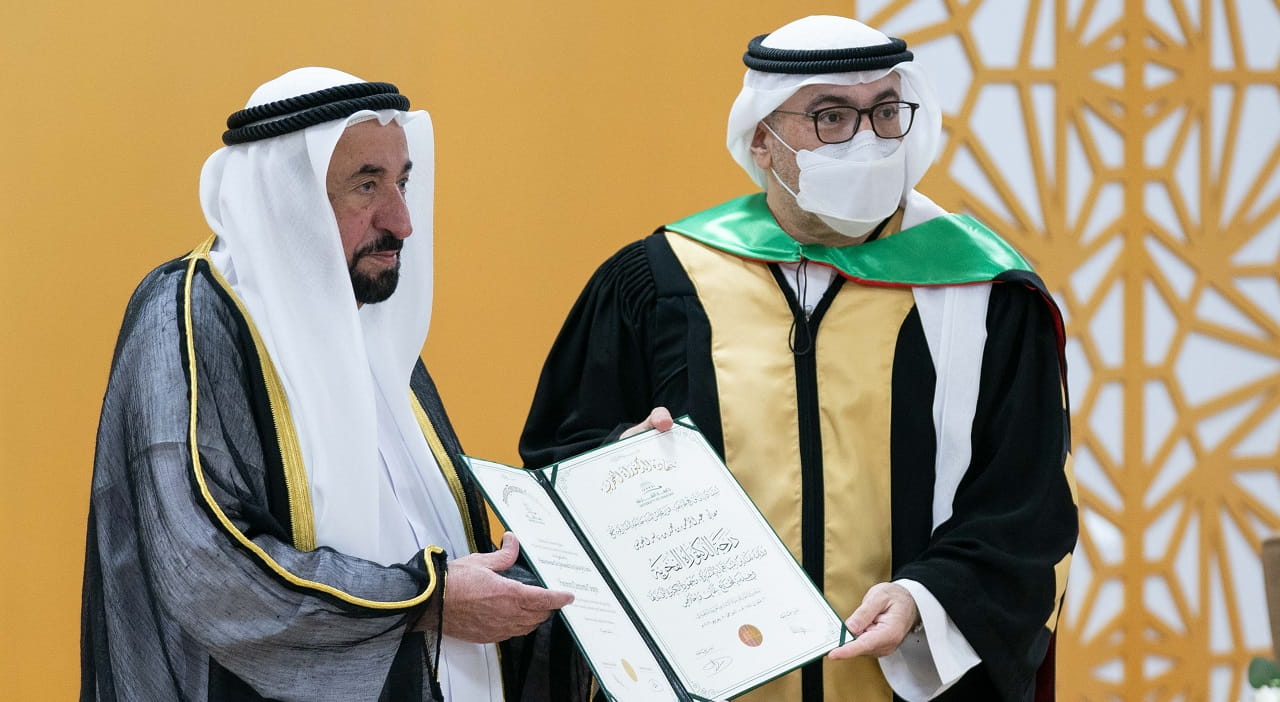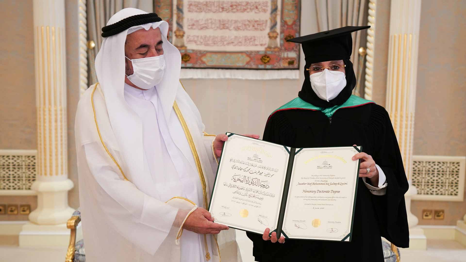 شهد صاحب السمو الشيخ الدكتور سلطان بن محمد القاسمي عضو المجلس الأعلى حاكم الشارقة رئيس جامعة الشارقة، عصر اليوم الاثنين، مراسم تسليم أولى شهادات الدكتوراه الفخرية من جامعة الشارقة إلى سمو الشيخة جواهر بنت محمد القاسمي قرينة صاحب السمو حاكم الشارقة رئيسة المجلس الأعلى لشؤون الأسرة، ومعالي عبد الرحمن بن محمد العويس وزير الصحة ووقاية المجتمع، والدكتور عارف النورياني المدير التنفيذي لمستشفى القاسمي، وذلك في المبنى الرئيسي للجامعة بالشارقة.