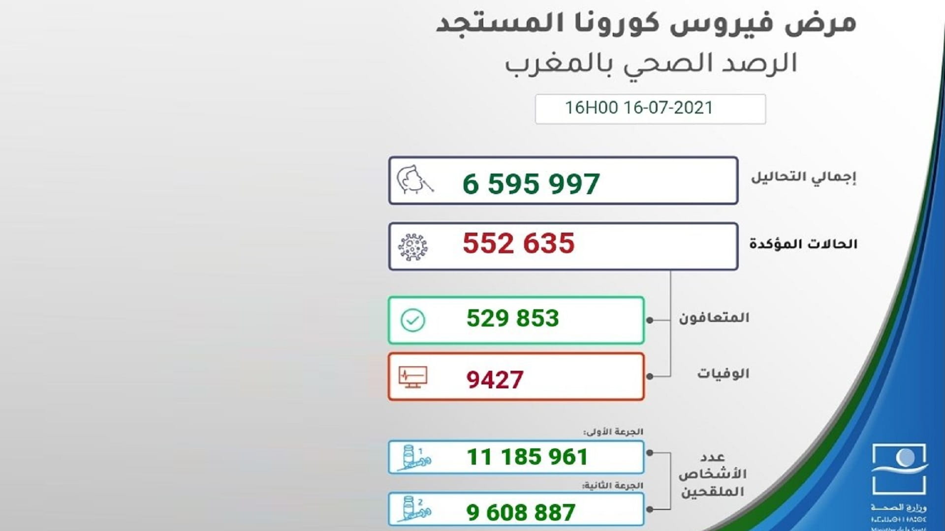 ونقل عن وزارة الصحة المغربية قولها في بيان لها، إن الحصيلة الجديدة رفعت العدد الإجمالي لحالات الإصابة المؤكدة بالمملكة المغربية إلى 552 ألفاً و635 حالة منذ الإعلان عن أول حالة في 2 مارس 2020، فيما بلغ مجموع حالات الشفاء التام 529 ألفاً و853 حالة بينما ارتفع عدد الوفيات إلى 9427 حالة.