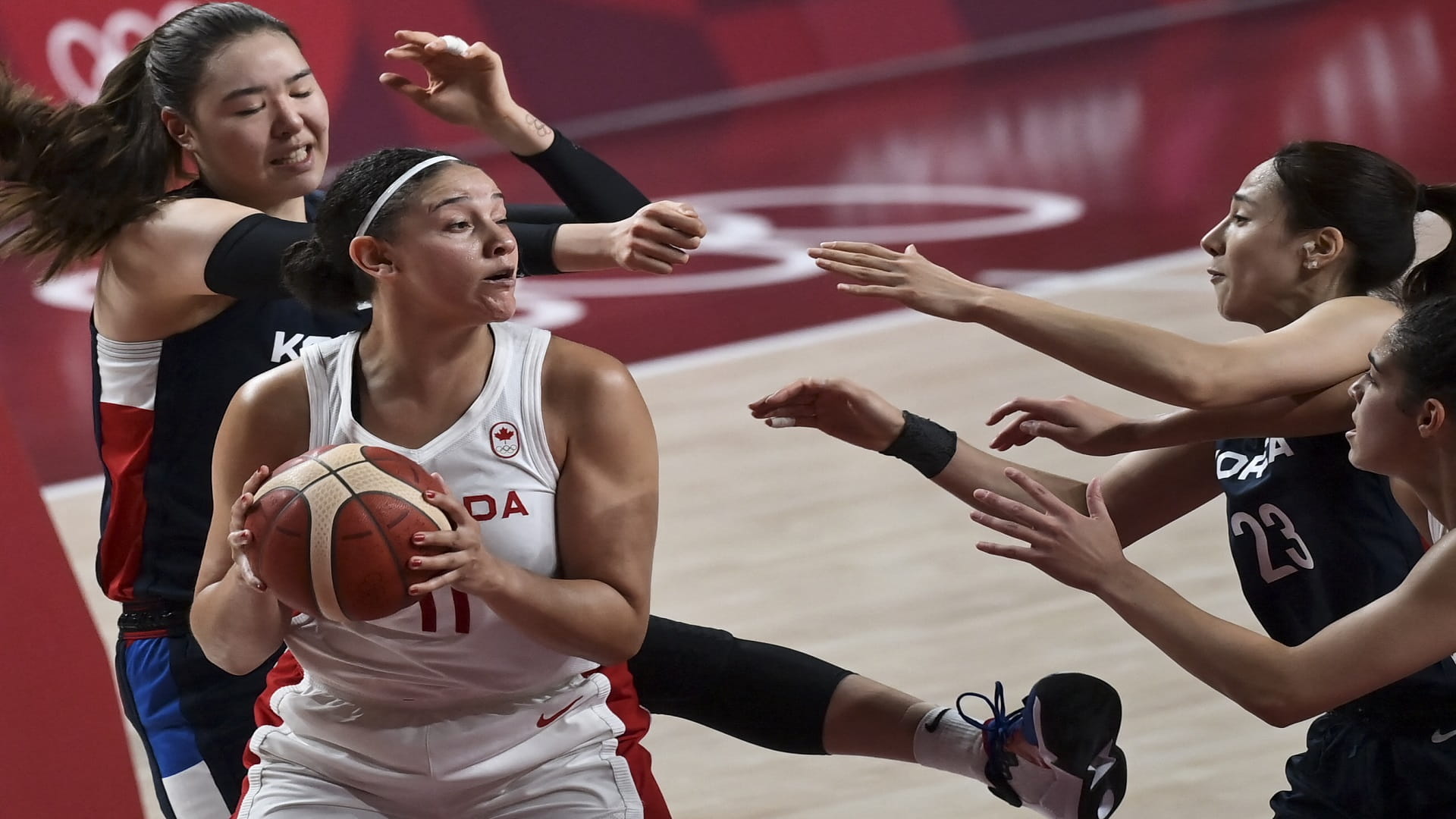 تغلب المنتخب الكندي على نظيره الكوري الجنوبي 74 / 53 اليوم الخميس في الجولة الثانية من مباريات المجموعة الأولى في منافسات كرة السلة للسيدات.