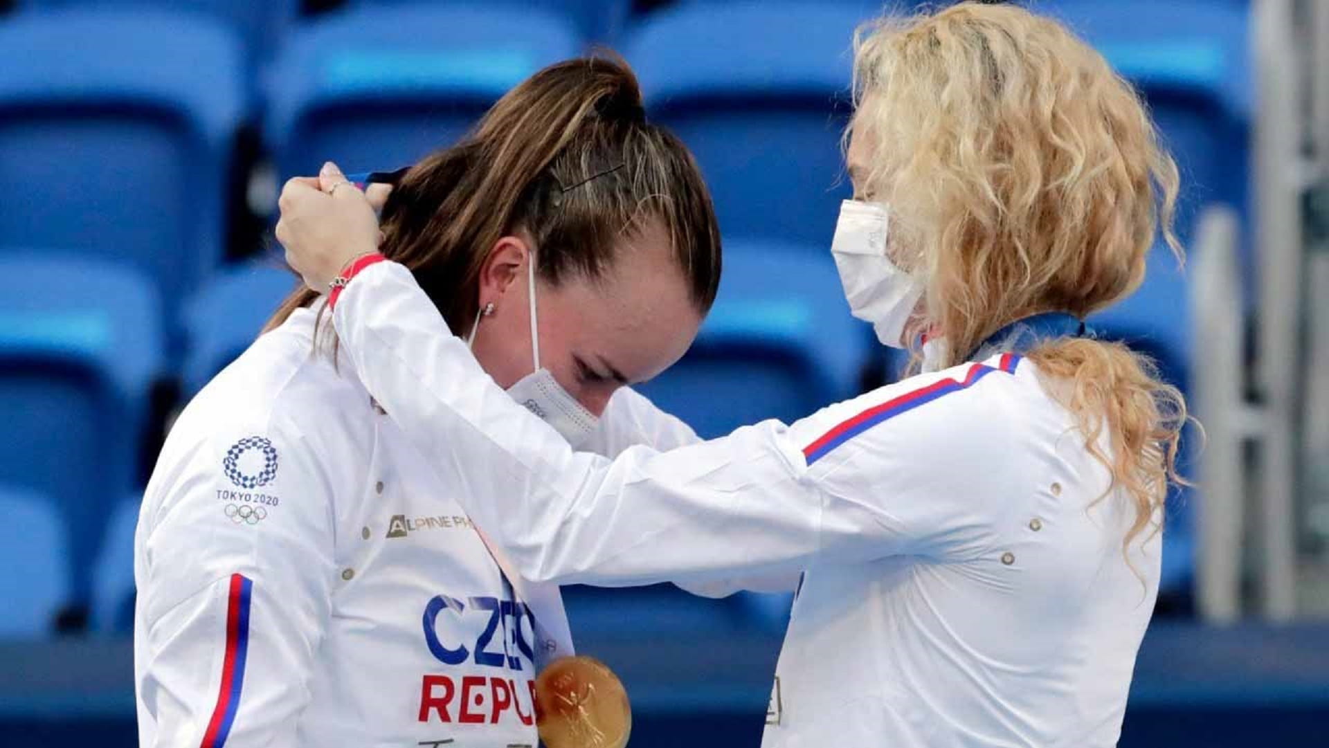 توج الثنائي التشيكي باربورا كريتشيكوفا وكاترينا سينياكوفا بالميدالية الذهبية لمنافسات التنس لزوجي السيدات ضمن أولمبياد طوكيو 2020.