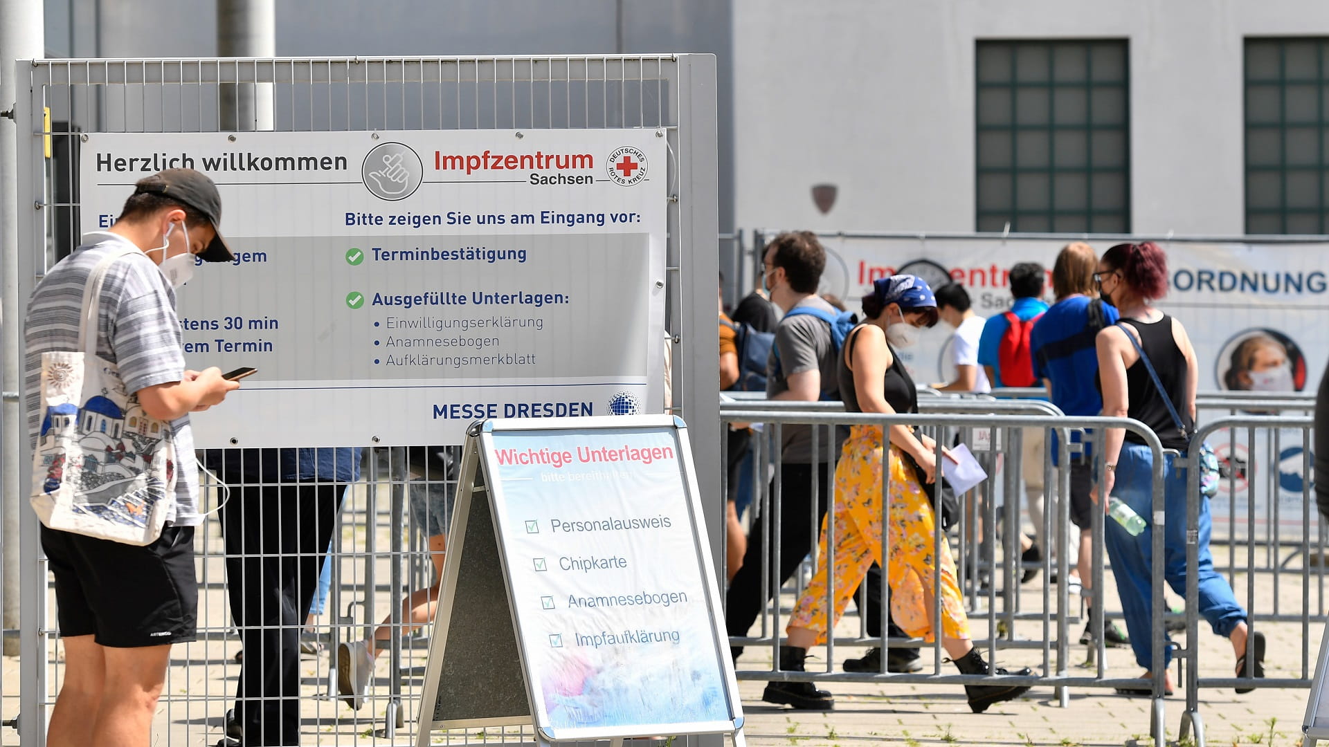 أشخاص مصطفون لتلقي لقاح مضاد لكورونا في مركز تطعيم في دريسدن بألمانيا