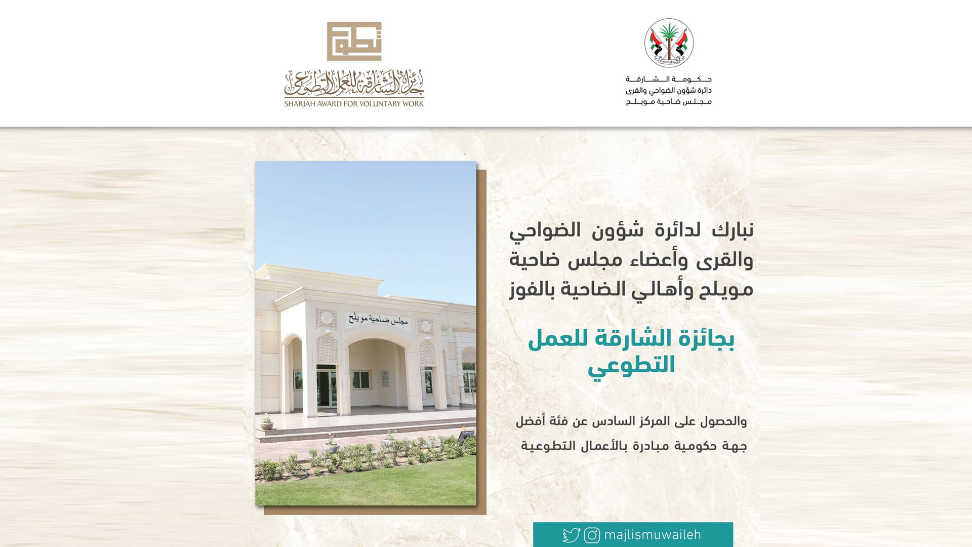 فاز مجلس ضاحية مويلح بمدينة الشارقة، في الدورة الـ18 لجائزة الشارقة للعمل التطوعي، ضمن فئة أفضل جهة حكومية مبادرة بالأعمال التطوعية، والحصول على المركز السادس.