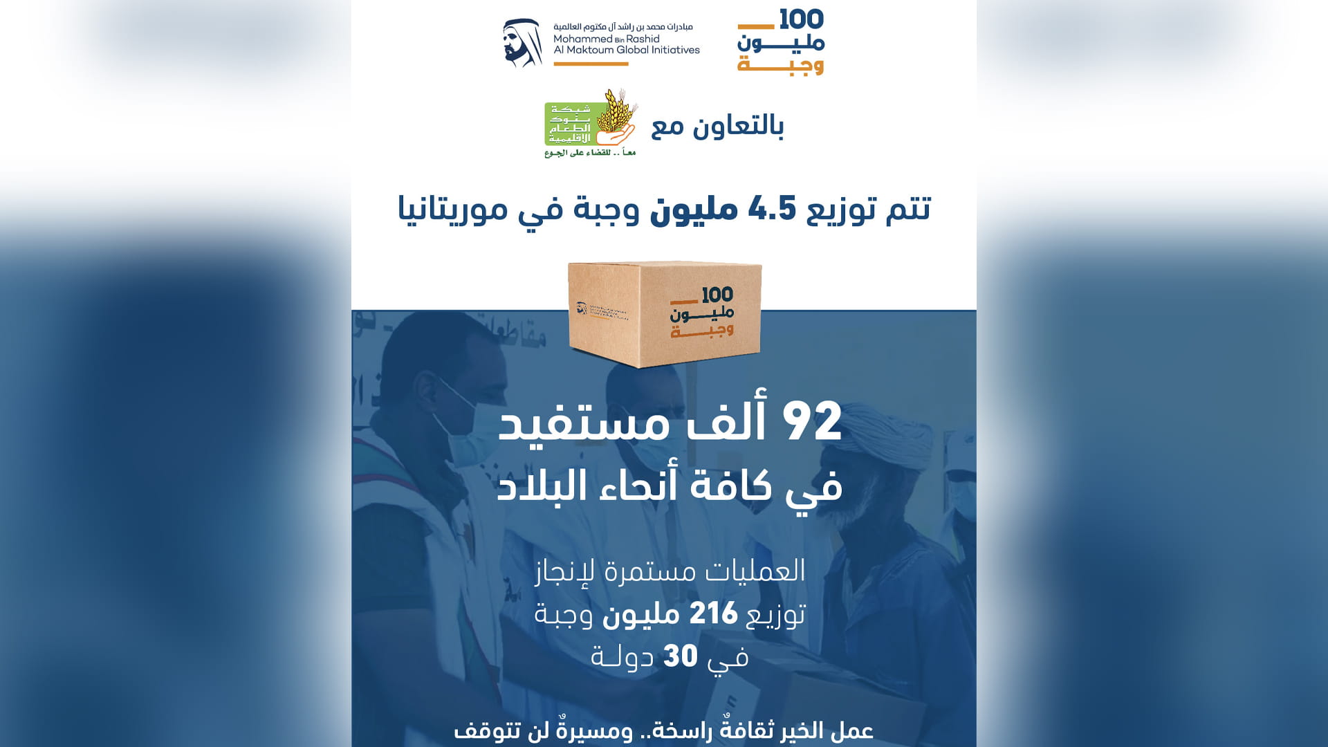 انتهت "حملة 100 مليون وجبة"، الأكبر في المنطقة لإطعام الطعام في 30 دولة في إفريقيا وآسيا وأوروبا وأميركا الجنوبية، من توزيع 4.5 مليون وجبة في جمهورية موريتانيا بالشراكة مع شبكة بنوك الطعام الإقليمية وبالتعاون مع الجهات المعنية والجمعيات الخيرية.