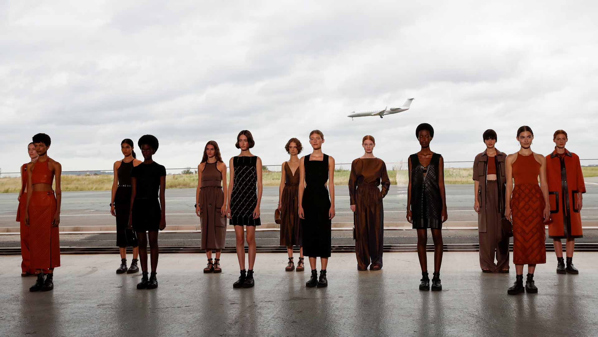 بعد انقطاع بسبب جائحة كوفيد-19، وفي لفتة جديدة، نقلت مجموعة هيرميس إنترناشونال الفرنسية للأزياء الفاخرة صحافيي الموضة إلى مطار في ضواحي باريس لحضور عرض لأزياء الربيع أُقيم على منصة عرض دائرية داخل حظيرة طائرات.