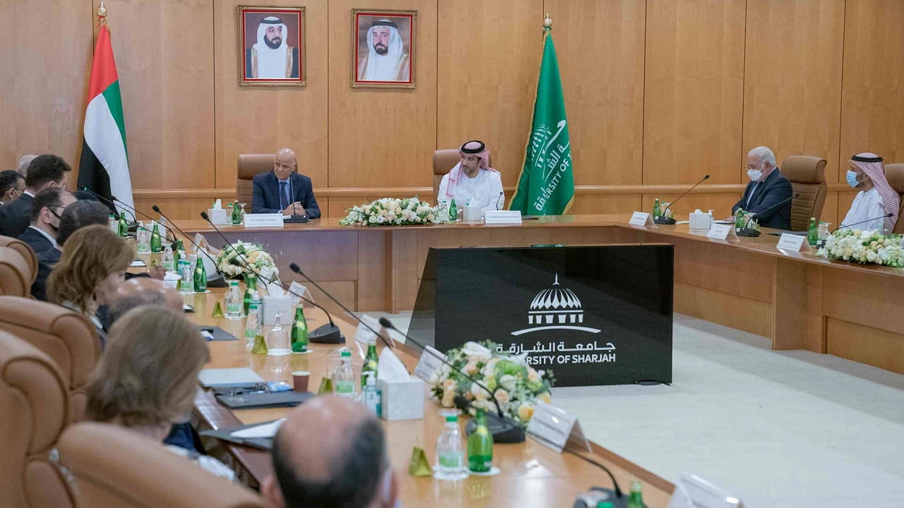 ورحب مدير جامعة الشارقة في كلمته، بسمو رئيس جامعة الشارقة، مقدماً نبذة عامة عن الجامعة التي تعتبر من كبريات جامعات الدولة والمنطقة، حيث يصل عدد الطلبة فيها في مختلف الكليات إلى 17500 طالباً وطالبة، بعدد برامج أكاديمية يصل إلى 114 برنامجاً في مختلف التخصصات العلمية والأدبية.