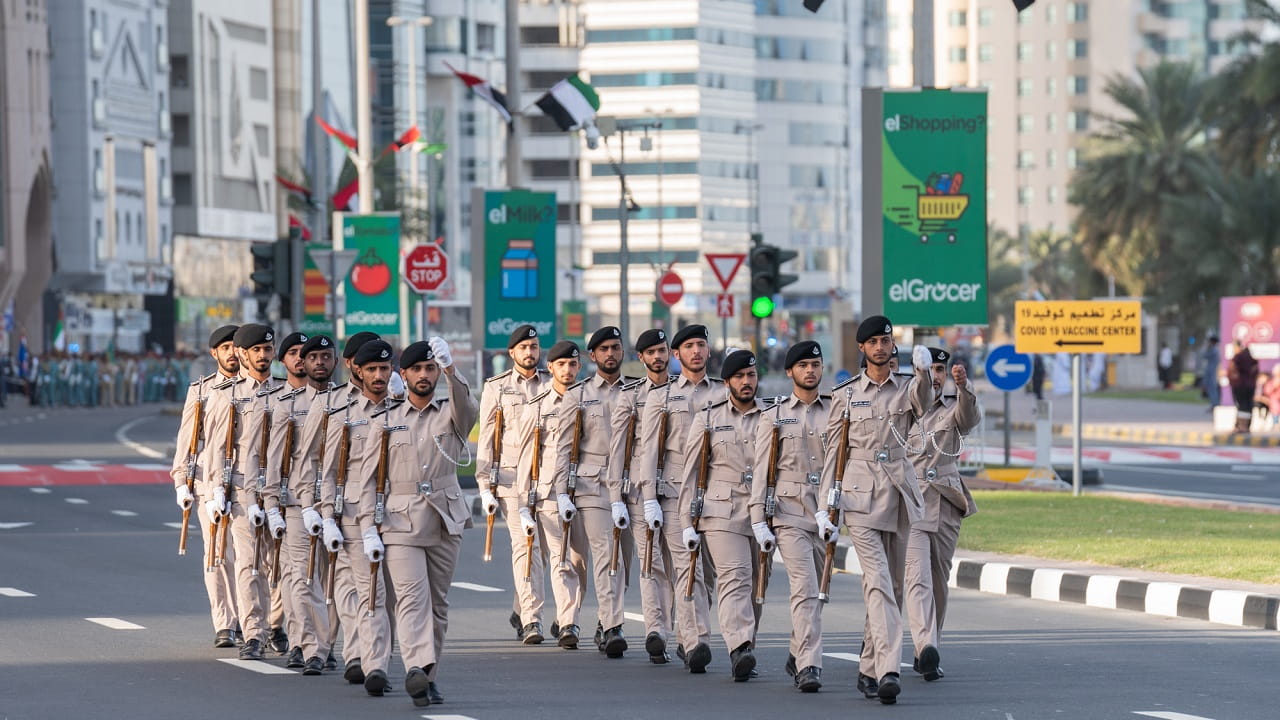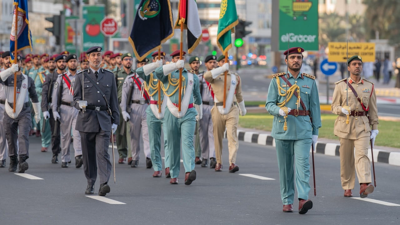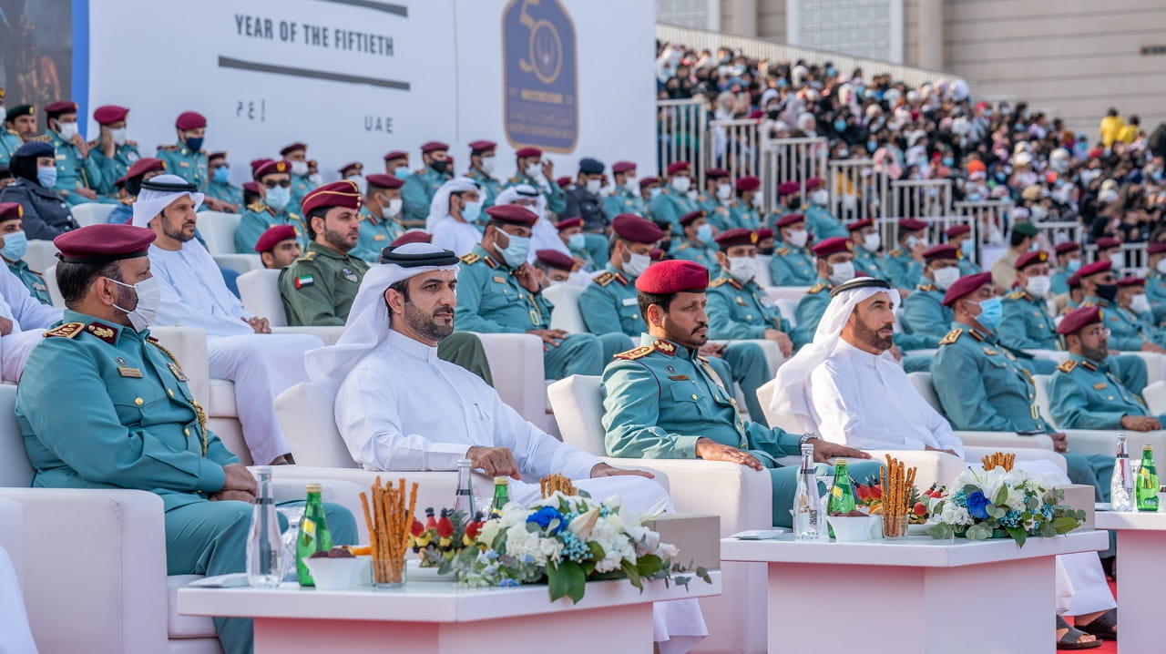 ليبدأ بعدها العرض العسكري الذي شارك فيه مختلف منتسبي وزارة الداخلية من كافة الإدارات والوحدات والمدارس العسكرية، بدأ العرض بمرور الطابور العسكري المهيب أمام منصات الحضور مقدماً التحية العسكرية لسمو نائب حاكم الشارقة، وليقابله الحضور الجماهيري بالوقوف والتحية والعرفان على جهود منتسبي وزارة الداخلية في حفظ الأمن والأمان.