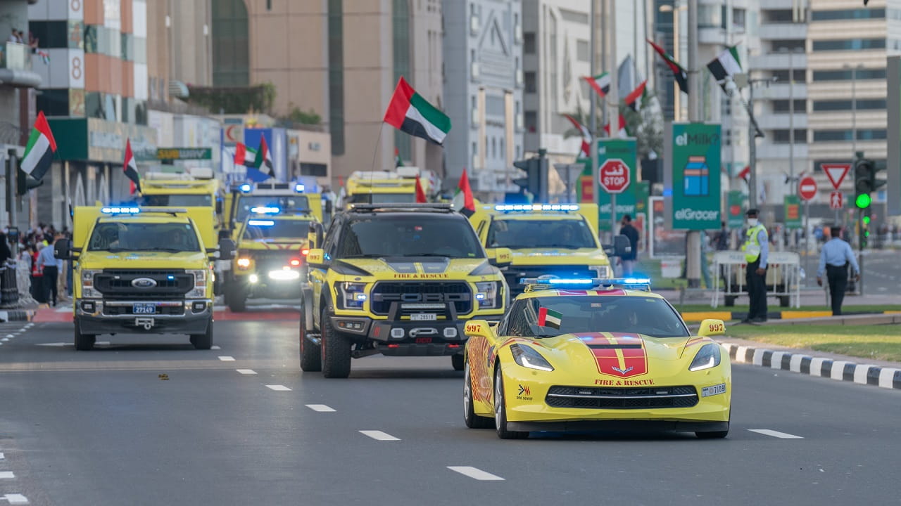 كما حلقت الطائرات المروحية في سماء الشارقة، رافعةً علم دولة الإمارات العربية المتحدة، وأعلام وزارة الداخلية والقيادات العامة للشرطة في الدولة.قب ذلك شاهد الحضور، مسيرة بحرية ضمت العديد من زوارق الإنقاذ البحري، والتي تستخدم في البيئات البحرية للتعامل مع مختلف الحالات.