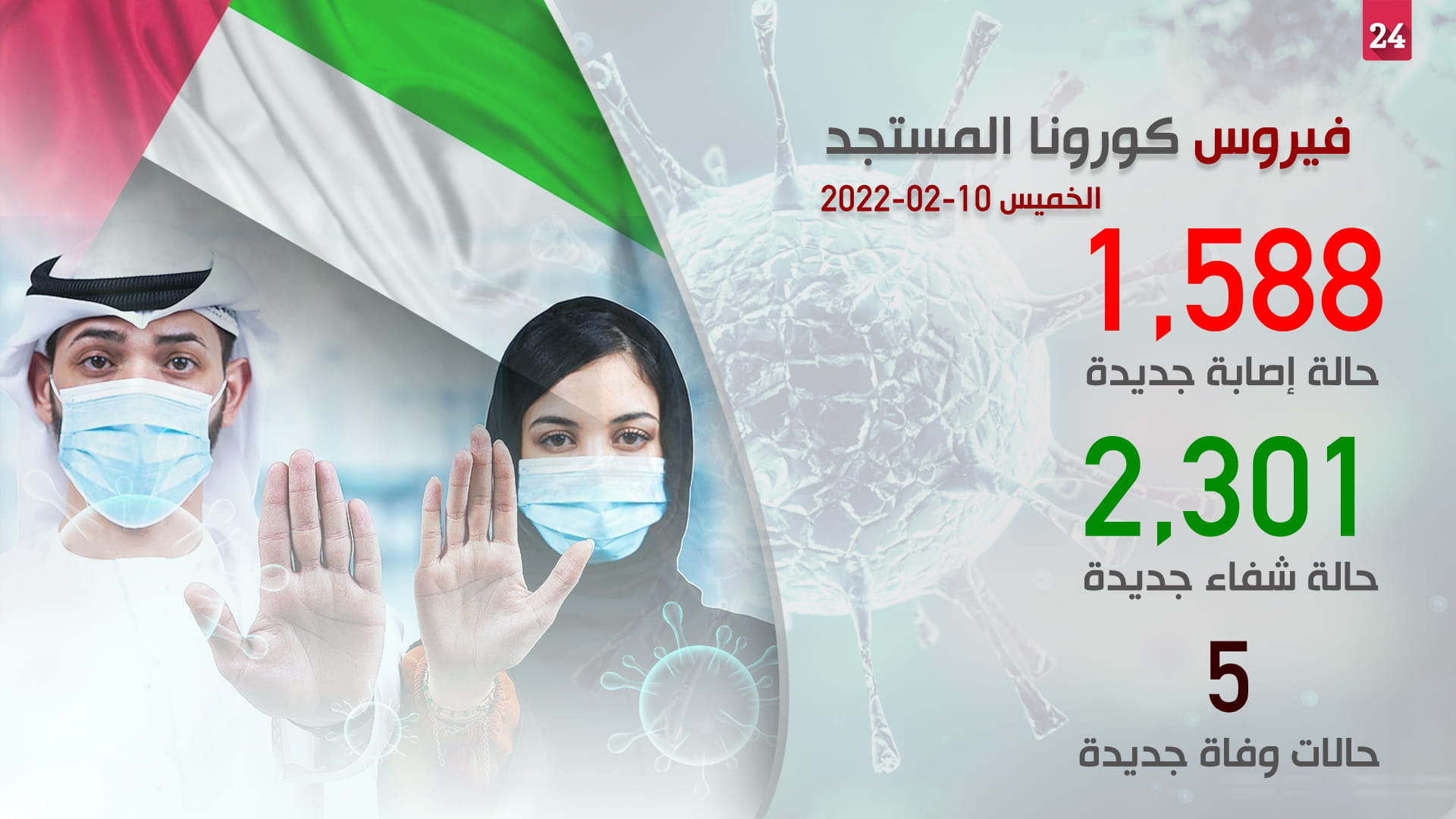 سجلت وزارة الصحة ووقاية المجتمع، الخميس، 1588 إصابة جديدة بفيروس كورونا "كوفيد-19"، و5 وفيات، و2301 حالة شفاء، ليبلغ بذلك إجمالي الإصابات في الإمارات 864102، والوفيات 2278، وحالات الشفاء 793619.