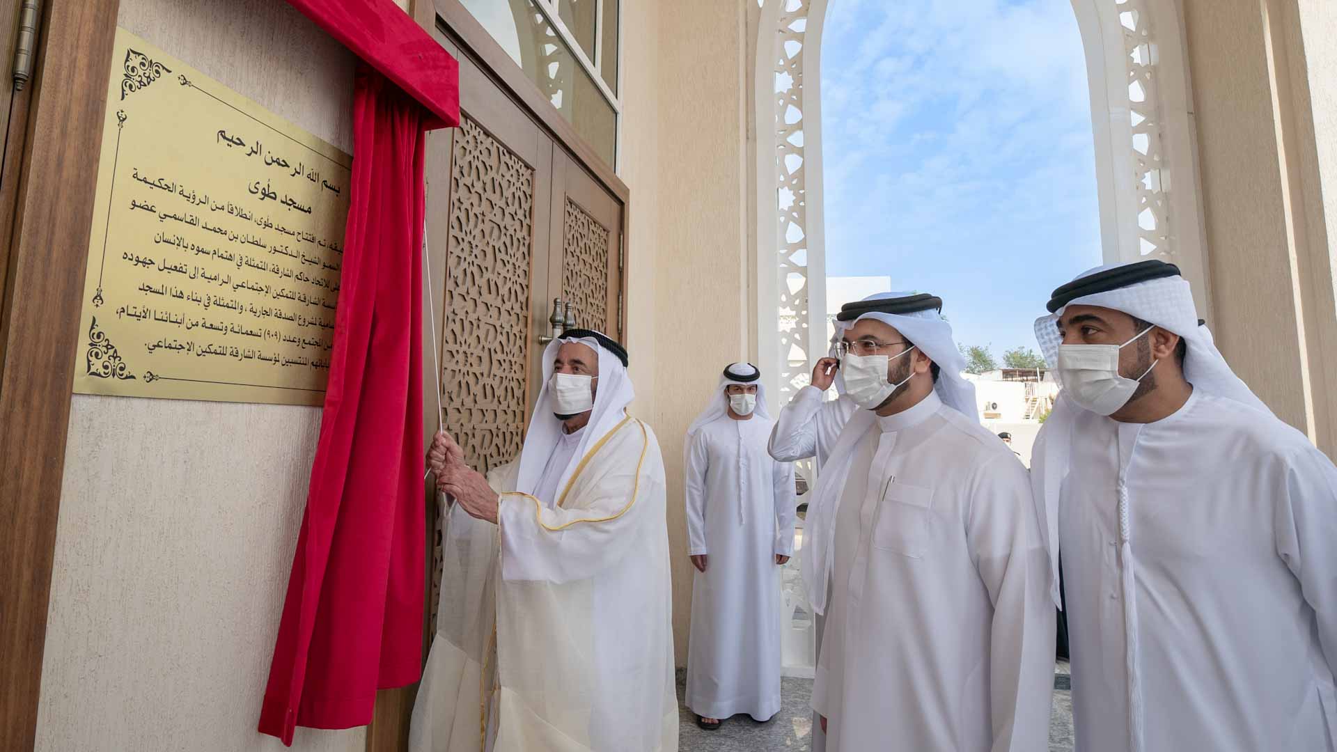 وفور وصول صاحب السمو حاكم الشارقة أزاح سموه الستار إيذاناً بافتتاح الجامع الذي ساهم في بنائه 909 يتيم وأسرهم، إضافة إلى مساهمات جزيلة من أفراد المجتمع.