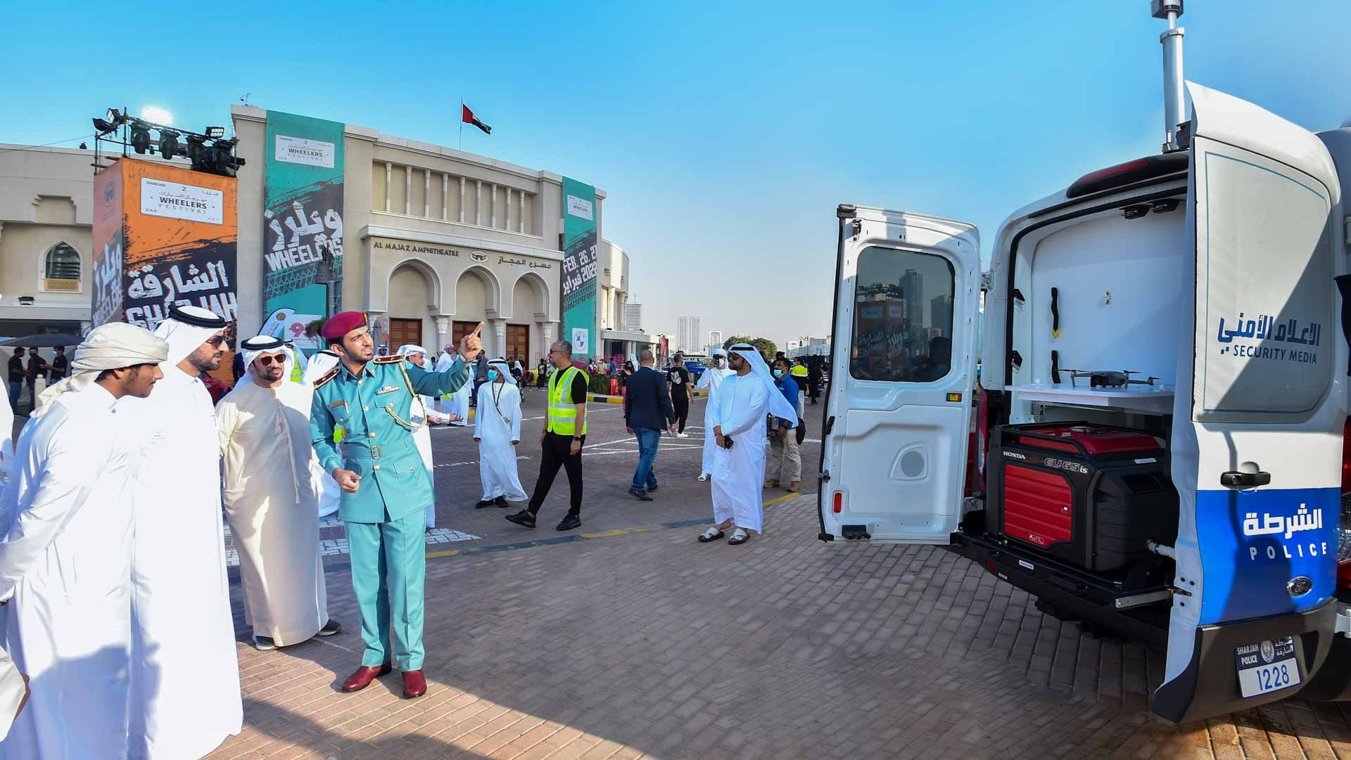 اطلع سمو الشيخ سلطان بن أحمد بن سلطان القاسمي، نائب حاكم الشارقة، رئيس مجلس الشارقة للإعلام خلال افتتاح سموه، فعاليات النسخة الثانية من مهرجان الشارقة للسيارات "ويلرز"، والذي ينظمه مسرح المجاز التابع للمكتب الإعلامي لحكومة الشارقة، على أحدث مركبات شرطة الشارقة، وآلياتها، وانظمتها الذكية.