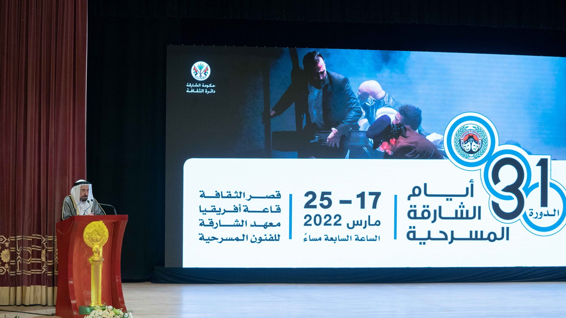 حضر افتتاح النسخة الـ 31 من أيام الشارقة المسرحية كل من الشيخ خالد بن عصام القاسمي رئيس دائرة الطيران المدني، والشيخ سالم بن عبد الرحمن القاسمي رئيس مكتب سمو الحاكم، وعدد من كبار المسؤولين رؤساء الدوائر الحكومية، وجمع من الفنانين والمثقفين.