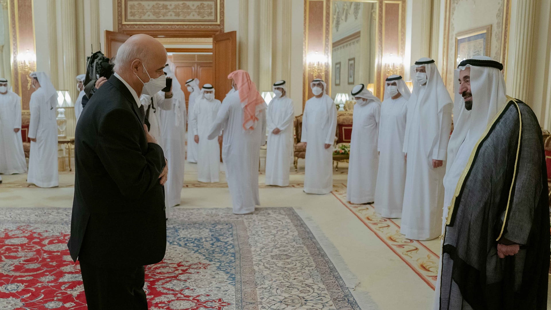 حضر الاستقبال كل من الشيخ محمد بن سعود القاسمي رئيس دائرة المالية المركزية، والشيخ خالد بن عبد الله القاسمي رئيس هيئة الشارقة للموانئ والجمارك والمناطق الحرة، والشيخ خالد بن عصام القاسمي رئيس دائرة الطيران المدني، والشيخ محمد بن حميد القاسمي رئيس دائرة الإحصاء والتنمية المجتمعية، والشيخ سعيد بن صقر القاسمي نائب رئيس مكتب سمو الحاكم في خورفكان، والشيخ هيثم بن صقر القاسمي نائب رئيس مكتب سمو الحاكم في كلباء، والشيخ فيصل بن سعود القاسمي مدير هيئة مطار الشارقة الدولي، ومعالي عبد الله مهير الكتبي وزير شؤون المجلس الأعلى للاتحاد، وسعادة راشد أحمد بن الشيخ رئيس الديوان الأميري، ورؤساء الدوائر والمؤسسات المحلية، ومدراء الجامعات بالشارقة.