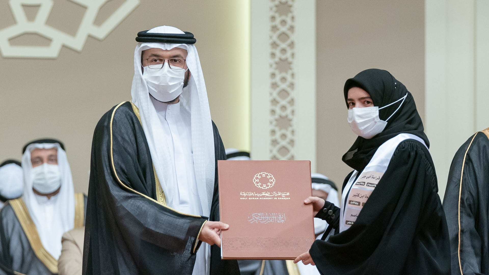 ثم سلم الدكتور خليفة الطنيجي رئيس مجمع القرآن الكريم الخريجين والخريجات شهاداتهم، مهنئاً إياهم بالحصول على الإجازات القرآنية ومتمنياً لهم التوفيق والسداد.