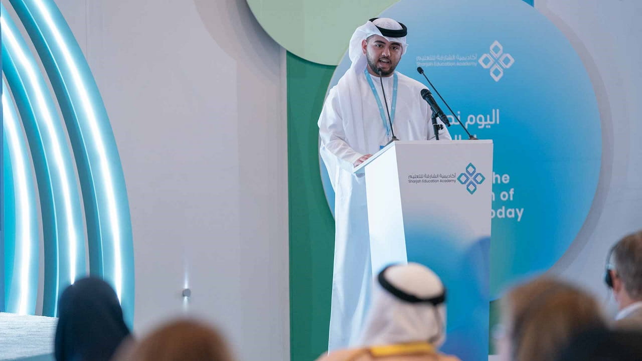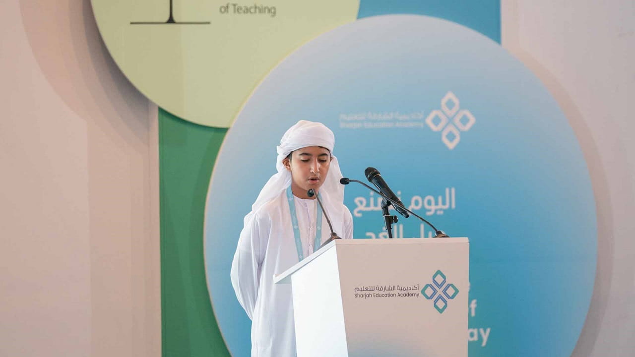 كما ألقى الطالب أحمد المرزوقي من مدرسة الشارقة الأمريكية الدولية كلمة تحدث خلالها عن تجربته في أكاديمية الشارقة للتعليم من خلال الدورات التدريبية والتي أثرت من معارفه وتجربته وفق معايير علمية ومهنية عالية.