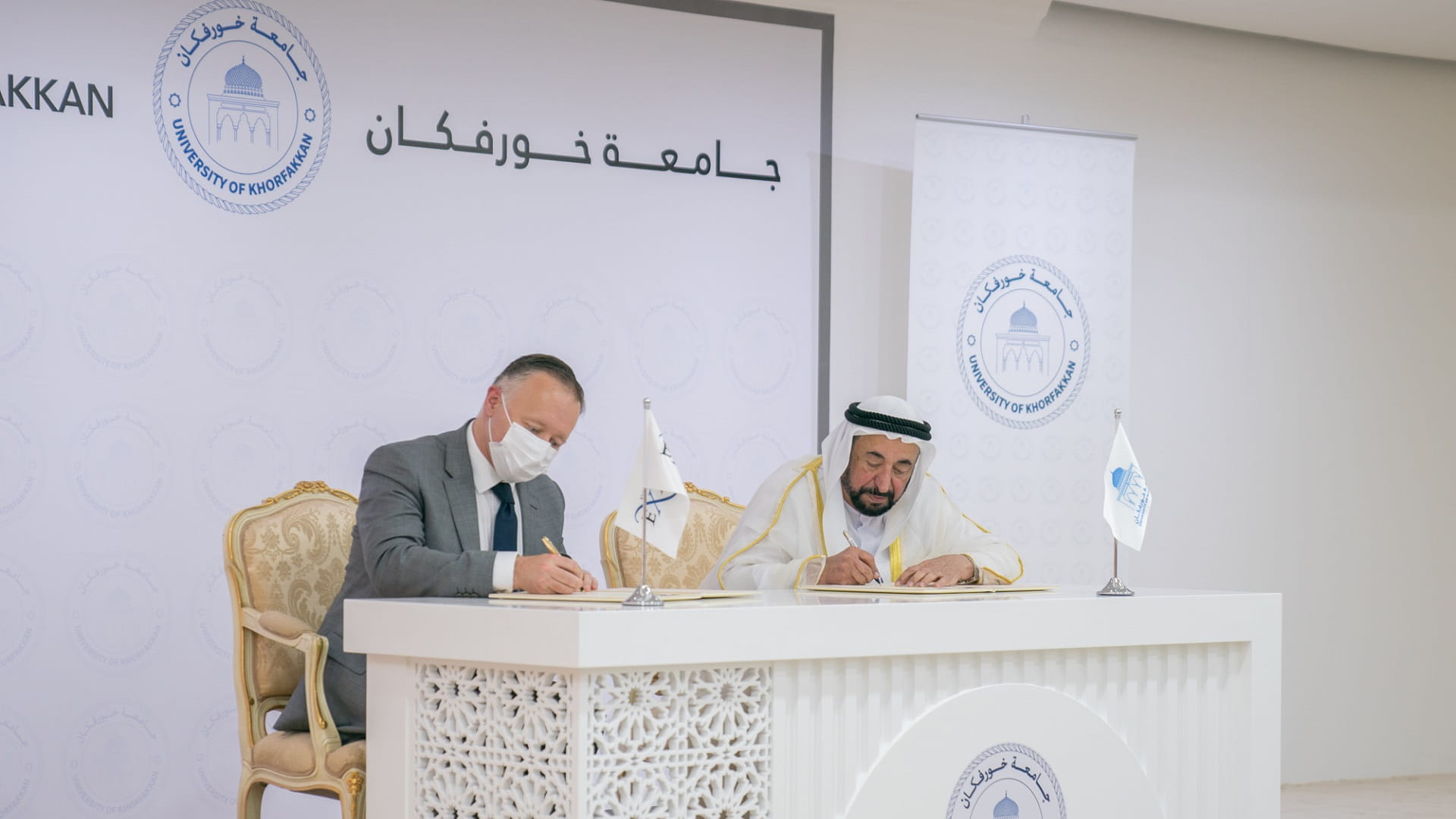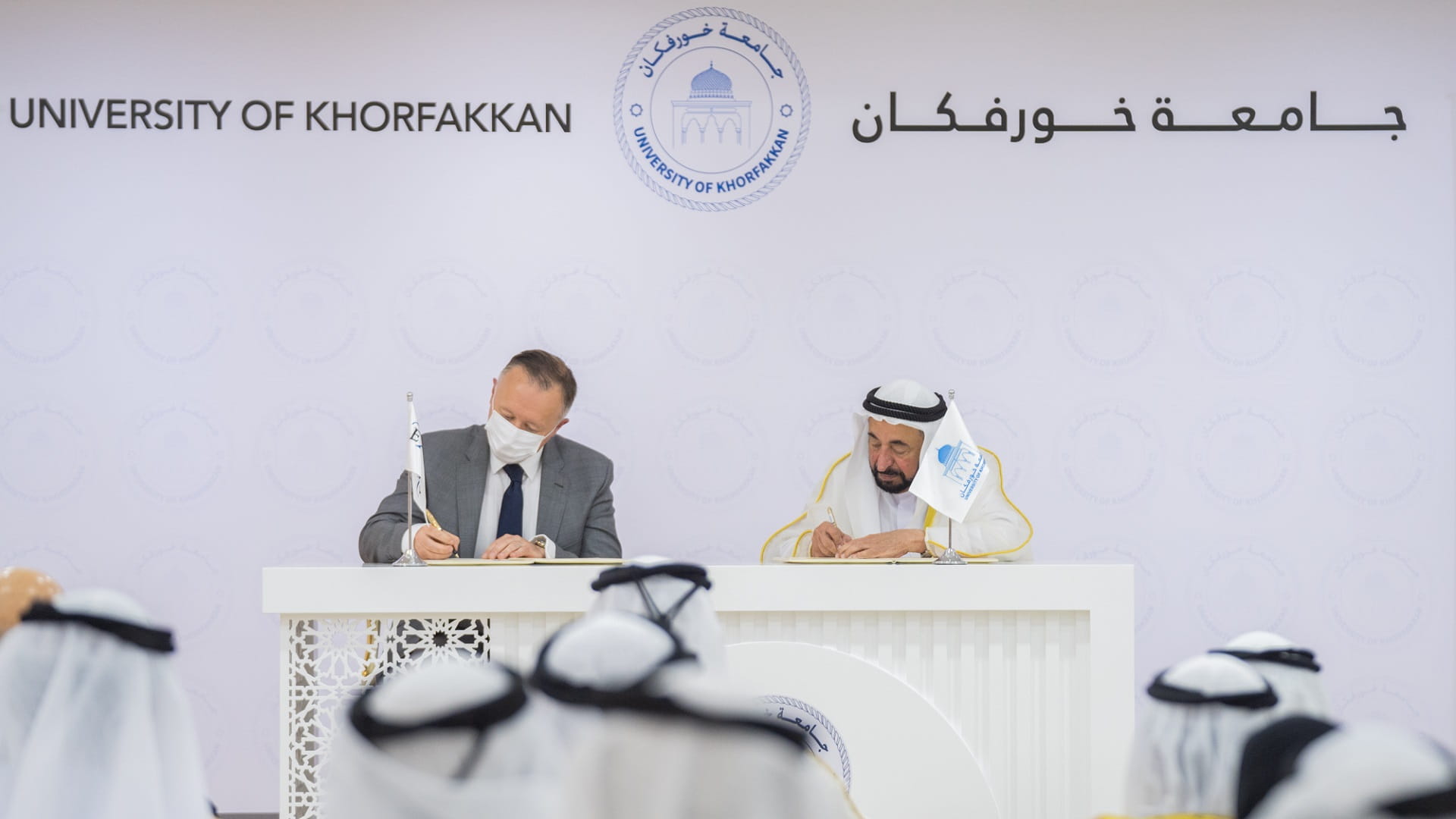 وتفضل صاحب السمو رئيس جامعة خورفكان بتوقيع مذكرة تفاهم بين جامعة خورفكان وجامعة إكستر التي وقع عنها الدكتور غاريث ستانزفيلدز نائب مدير الجامعة المدير التنفيذي لكلية الدراسات الاجتماعية والدولية.