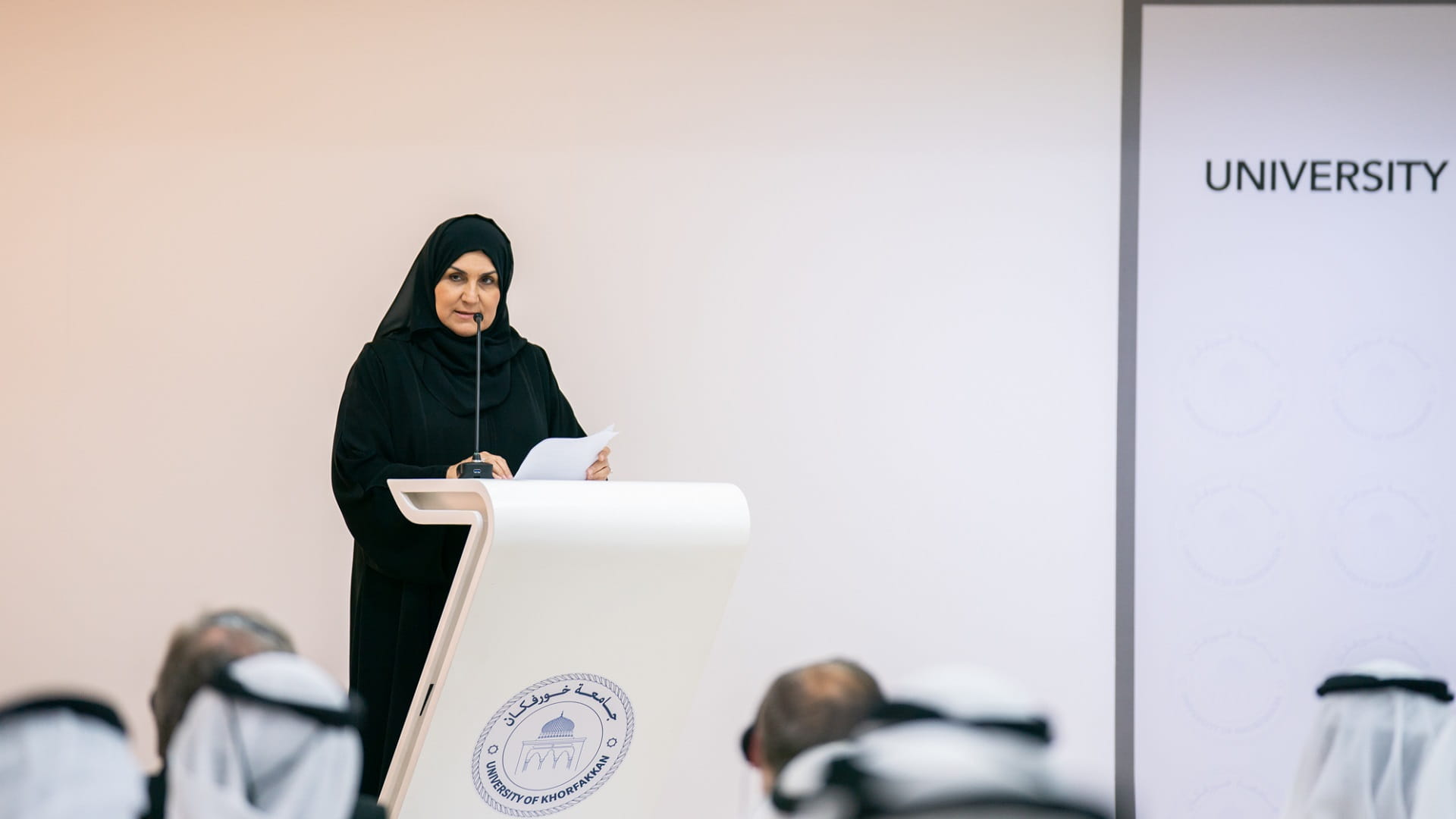 وتخلل حفل الافتتاح كلمة للدكتور حميد مجول النعيمي مدير جامعة الشارقة أشار فيها إلى تنفيذ توجيهات صاحب السمو حاكم الشارقة بتحويل فرع الجامعة بخورفكان إلى جامعة ذات كيان مستقل من خلال اتخاذ كافة التدابير والإجراءات القانونية والإدارية والفنية والأكاديمية اللازمة إلى أن تكاملت المتطلبات الأساسية لهذا الفرع ليكون جامعة مستقلة تحمل اسم: جامعة خورفكان.