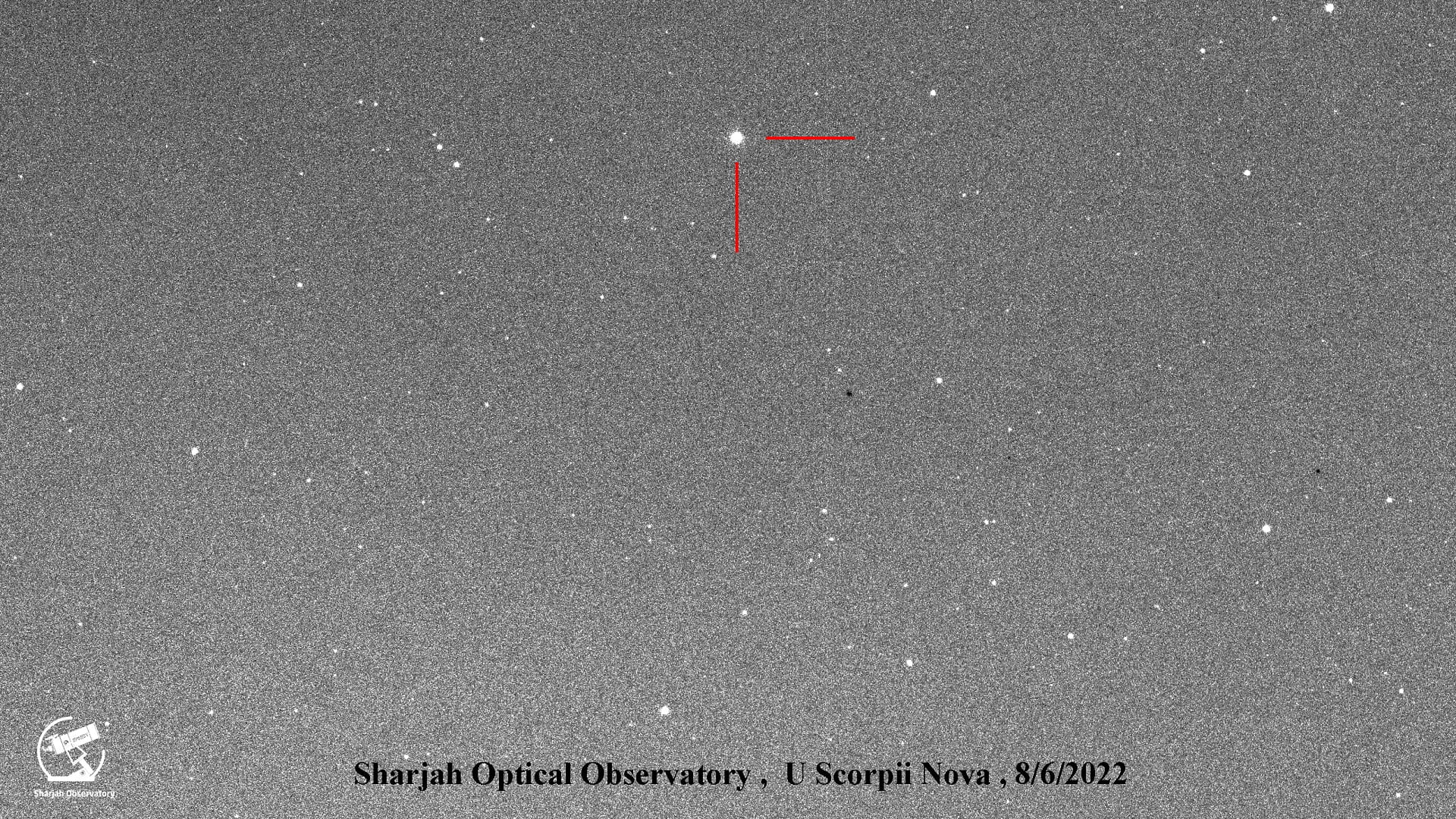 رصد فريق مرصد الشارقة البصري في أكاديمية الشارقة لعلوم وتكنولوجيا الفضاء والفلك التابعة لجامعة الشارقة، النجم المستعر المعروف بـ U Scorpii Nova))، الذي اكتشف خلال الفترة السابقة في كوكبة العقرب، ووصل إلى أقصى لمعان له في السادس من يونيو 2022م، حيث تجاوز القدر الثامن ووصل إلى القدر الظاهري (7.7)، وهو بالأصل من القدر الثامن عشر، ثم بدأ بالخفوت تدريجياً. ويبعد هذا المستعر حوالي 64 ألف سنة ضوئية، وكان من المتوقع أن ينفجر هذا النجم في عام 2020م بعد أن كان آخر انفجار له في 28 يناير 2010م.