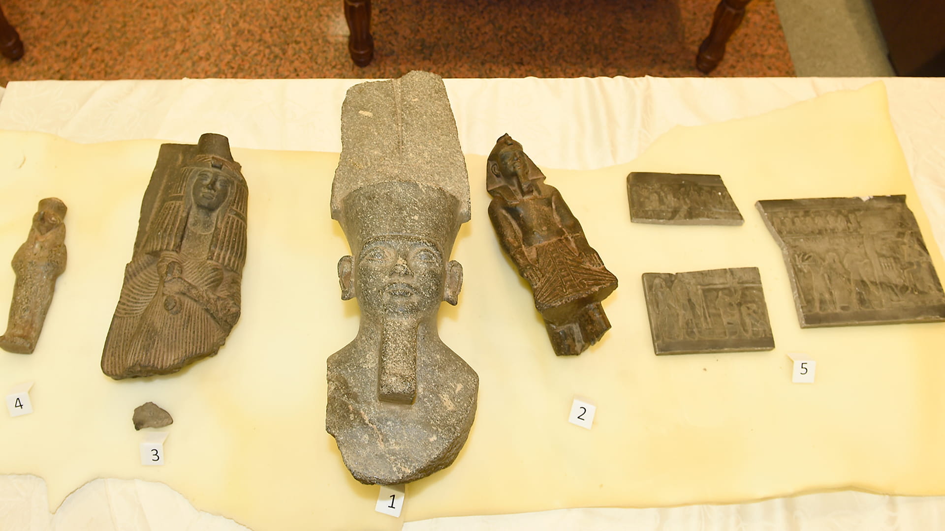 وتضم المجموعة المضبوطة، أربعة تماثيل لملوك من الحضارة المصرية القديمة، منها تمثال للملك أمنحوتب الثالث من الأسرة الثامنة عشرة، وآخر للإله آمون رع وتمثال لسيدة بالزي التقليدي وتمثال للإله حورس الذي صورته الحضارة برأس صقر إضافة إلى جدارية صخرية منقوشة.