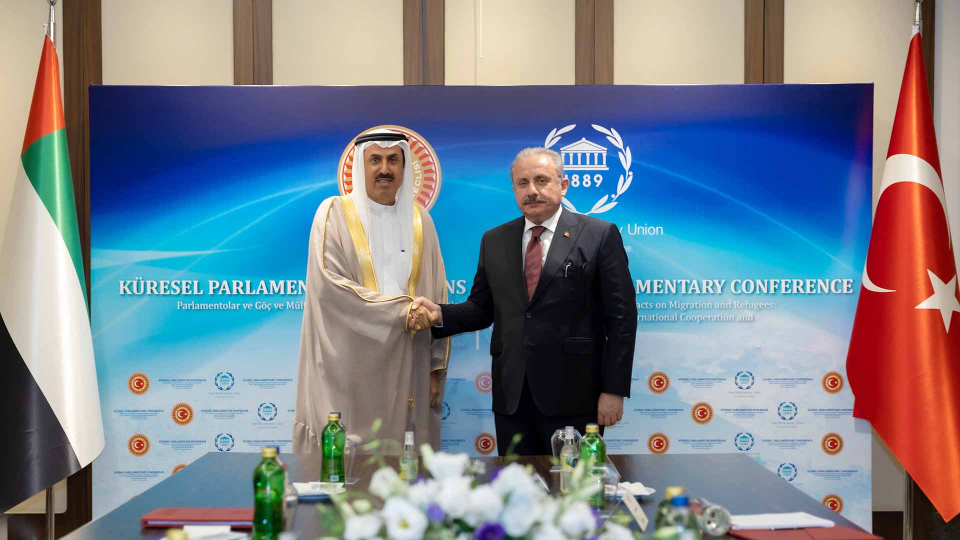 التقى معالي صقر غباش رئيس المجلس الوطني الاتحادي، مع البروفيسور مصطفى شنطوب، رئيس الجمعية الوطنية الكبرى لجمهورية تركيا "البرلمان"، على هامش أعمال المؤتمر البرلماني العالمي المعني بالهجرة، المنعقد حالياً في مدينة إسطنبول.