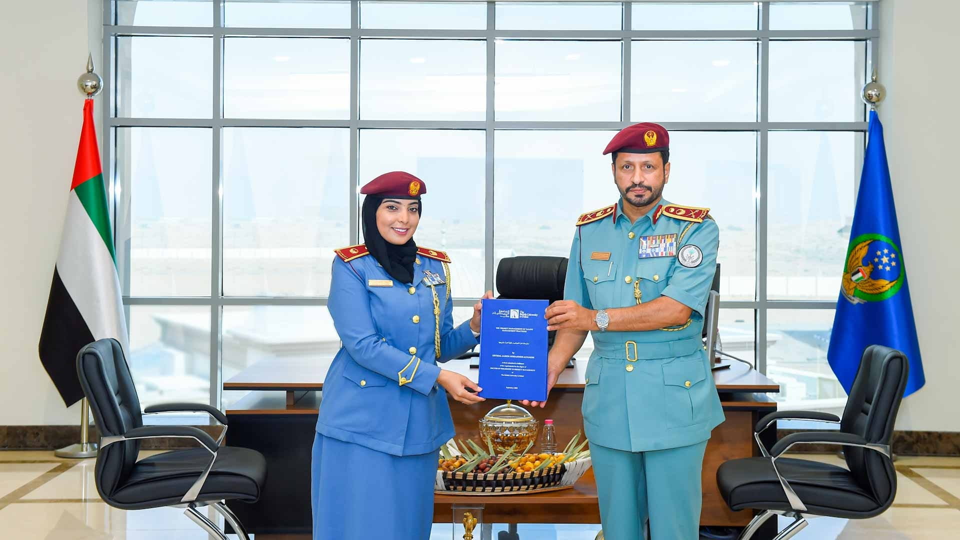 هنأ سعادة اللواء سيف الزري الشامسي قائد عام شرطة الشارقة بمكتبه صباح اليوم، الرائد دكتور ابتهال جاسم محمد بالعمى مدير فرع الاستراتيجية والتميز بإدارة الشؤون المالية، بمناسبة حصولها على درجة الدكتوراه في ممارسات إدارة المواهب وكيفية إدارة مشاريعها، من الجامعة البريطانية بدبي، ويُعنى التخصص بإدارة المورد البشري بكفاءة وفعالية، وتطوير منظومة لإدارة المواهب بأحدث الأساليب العلمية وفق الممارسات العالمية التي تخدم عمليات إدارة الخدمات والموارد البشرية، وتحقق أهداف المؤسسة في كافة المجالات، ومنها المجال الأمني.