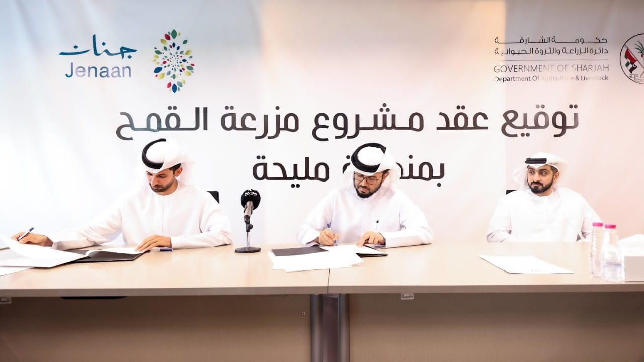 أبرمت دائرة الزراعة والثروة الحيوانية في الشارقة بمقرها، مذكرة تفاهم مشتركة مع شركة جنان للاستثمار ومقرها أبوظبي، تهدف إلى التعاون والتنسيق في تشغيل مزرعة القمح بمنطقة مليحة التي تمتد على مساحة 1900 هكتار.
