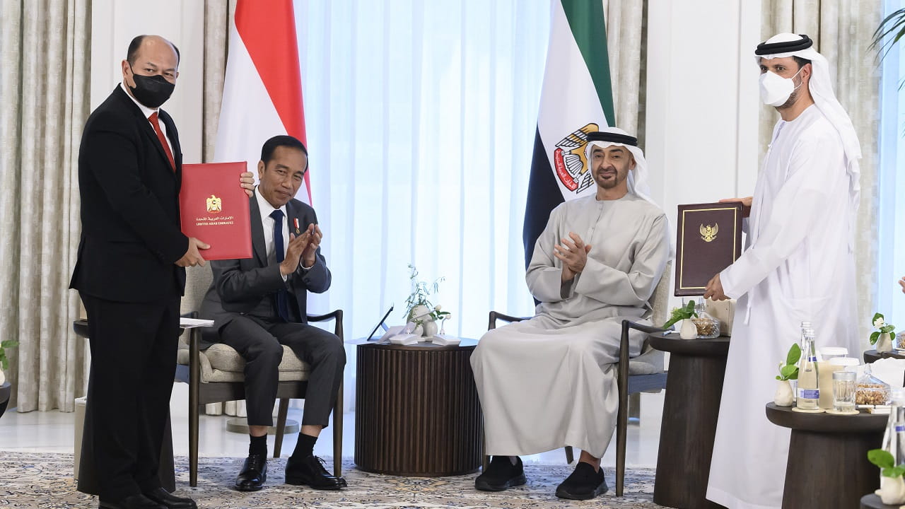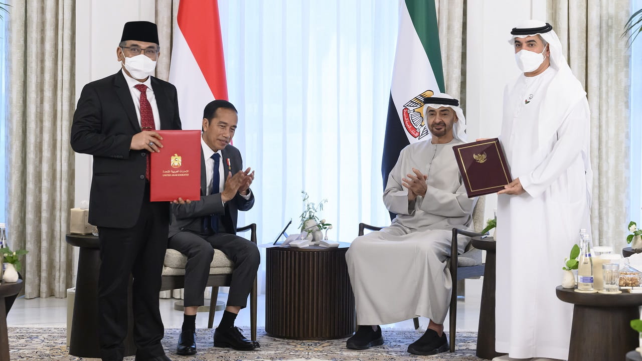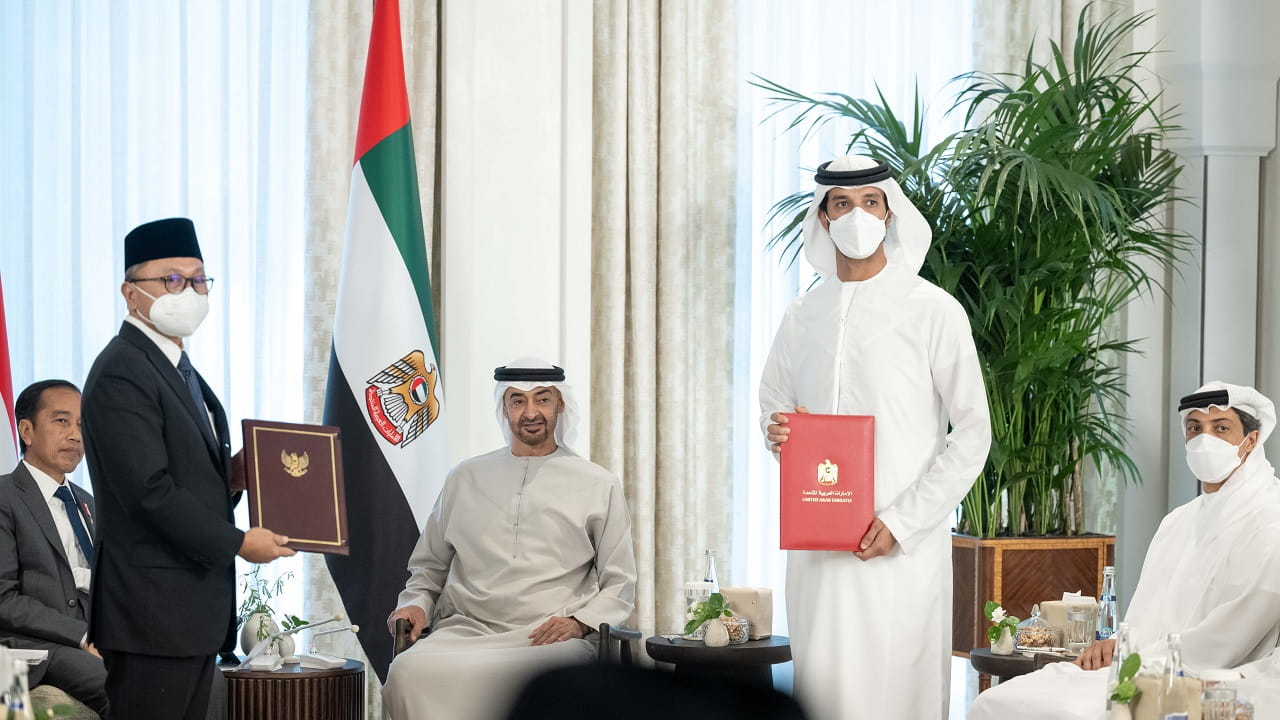 شهد صاحب السمو الشيخ محمد بن زايد آل نهيان رئيس الدولة "حفظه الله"، وجوكو ويدودو رئيس جمهورية إندونيسيا، اليوم الجمعة، مراسم تبادل اتفاقية شراكة اقتصادية شاملة بين دولة الإمارات وإندونيسيا.