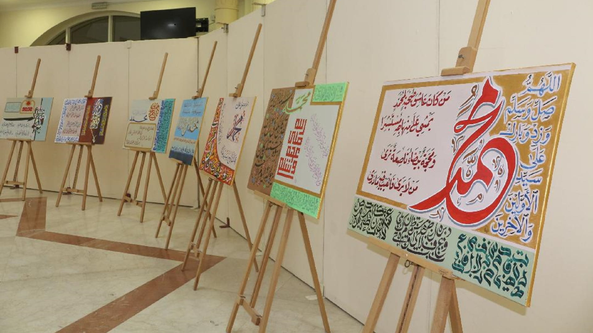 وعند التجول في المعرض، يأسرك التنوع في الخطوط والألوان، فالكعبي يتنقل في لوحاته بسلاسة بين الثلث والنسخ والديواني والكوفي والوسام والفارسي وغيرها، ليقدم لوحات مشغولة بالفن، وفي إحدى لوحاته كتب في الزاوية العليا جملة "الله صل وسلم على محمد" بالتنقيط الذي هو ميزان الحروف، ثم كتب تحتها بخط الثلث بيتاً من شعره هو: فداك الروح يا سندي فداكا.. وقومي كلهم عدم سواكا.