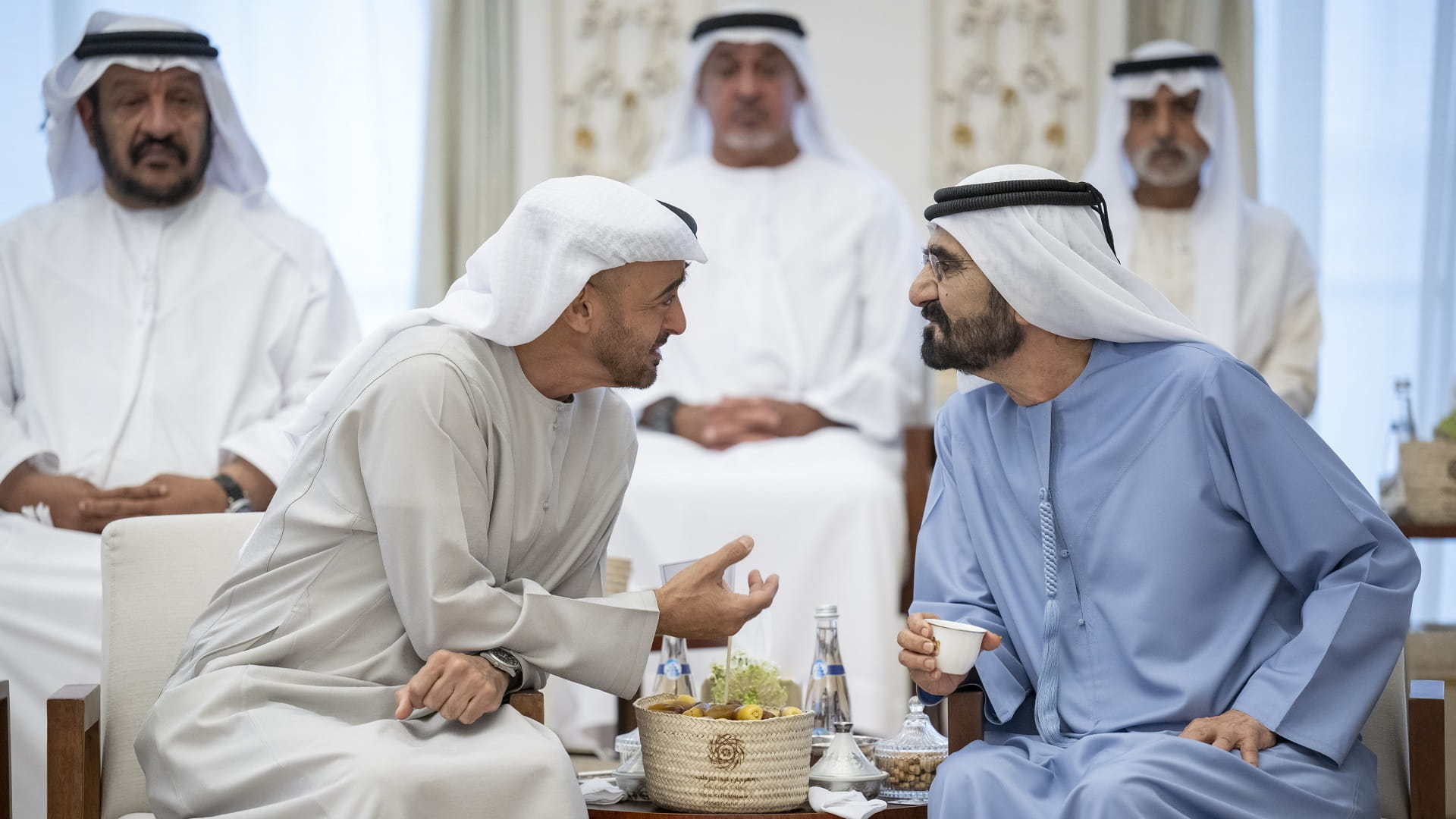 استقبل صاحب السمو الشيخ محمد بن زايد آل نهيان رئيس الدولة "حفظه الله"، اليوم الثلاثاء، في مجلس قصر البحر، أخاه صاحب السمو الشيخ محمد بن راشد آل مكتوم نائب رئيس الدولة رئيس مجلس الوزراء حاكم دبي "رعاه الله"، يرافقه سمو الشيخ مكتوم بن محمد بن راشد آل مكتوم نائب حاكم دبي نائب رئيس مجلس الوزراء وزير المالية.
