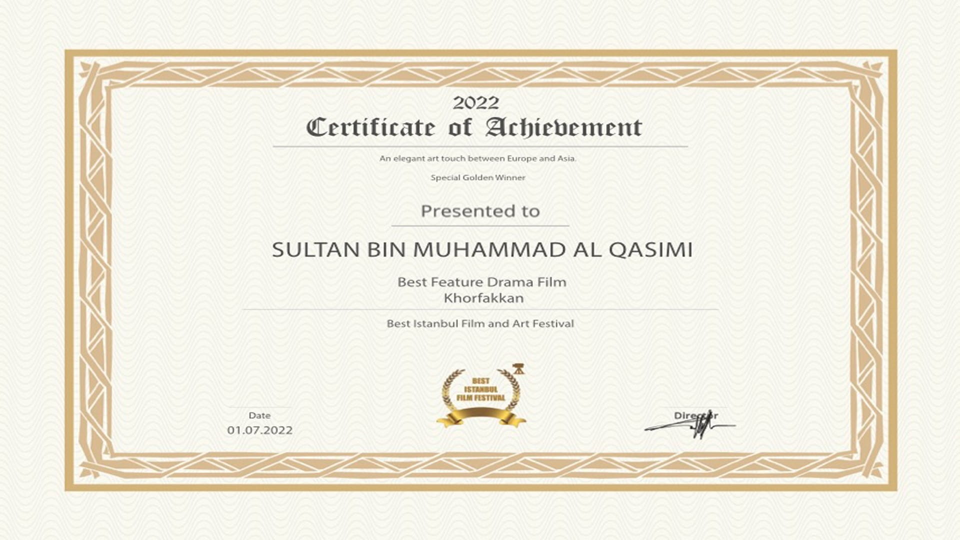 حصد فيلم خورفكان، من تأليف صاحب السمو الشيخ الدكتور سلطان بن محمد القاسمي عضو المجلس الأعلى حاكم الشارقة، الجائزة الذهبية لأفضل فيلم روائي درامي في مهرجان بيست إسطنبول للأفلام السينمائية عن الدورة الحالية يوليو 2022 م، وجائزة أفضل فيلم تاريخي في مهرجان بروكسل السينمائي.