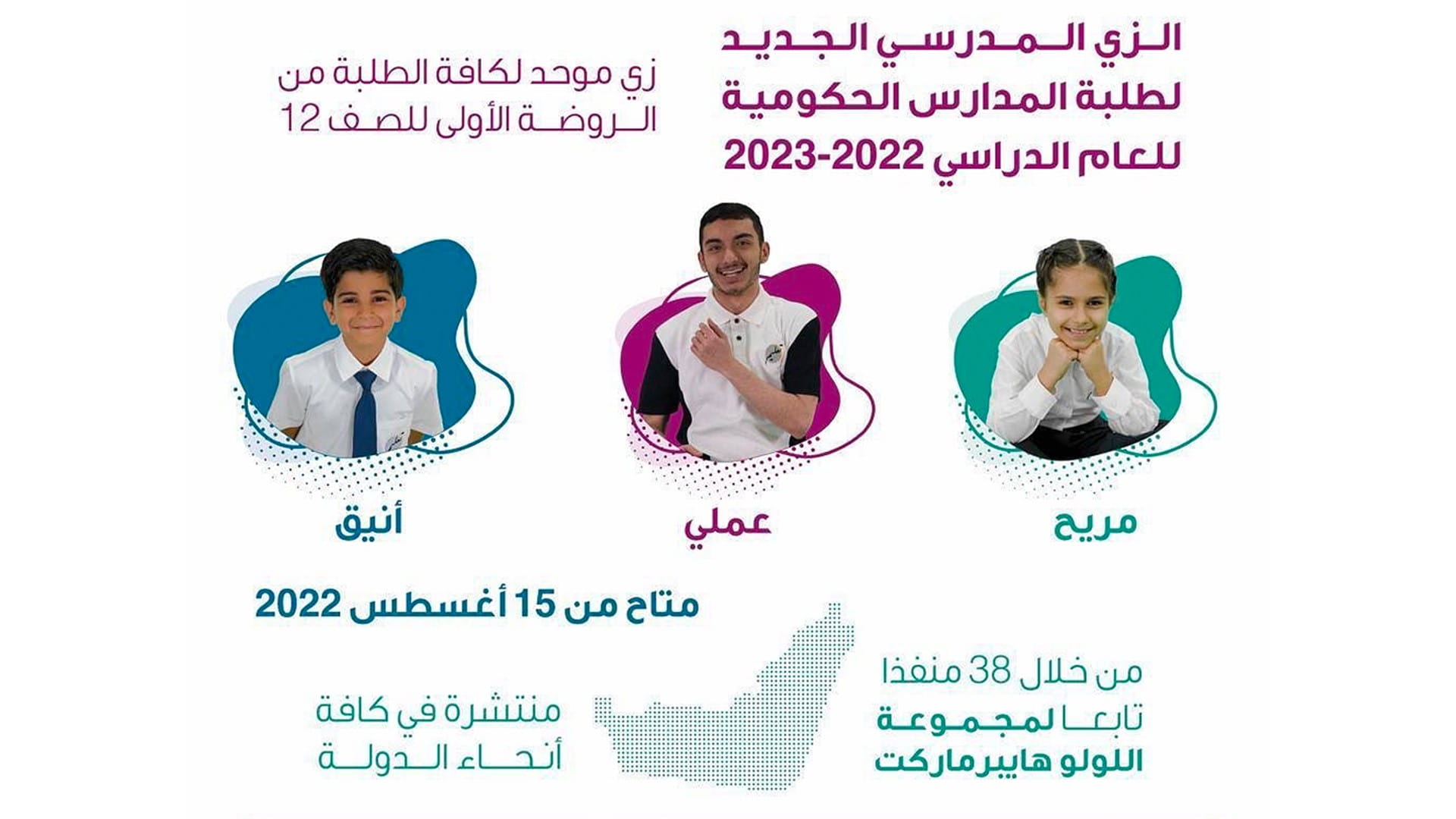 وروعي في التصاميم الجديدة، أن تكون الألوان منحصرة في اللونين الأبيض والكحلي، بحيث تكون مريحة وموحدة وجاذبة ومناسبة لكلا الجنسين ولمختلف الأعمار، وسيتم بيع الزي المدرسي للطلبة وأولياء الأمور من خلال 38 منفذاً للبيع موزعة على مختلف مناطق الدولة وتابعة لمجموعة اللولو هايبر ماركت المورد المعتمد من قبل مؤسسة الإمارات للتعليم المدرسي.