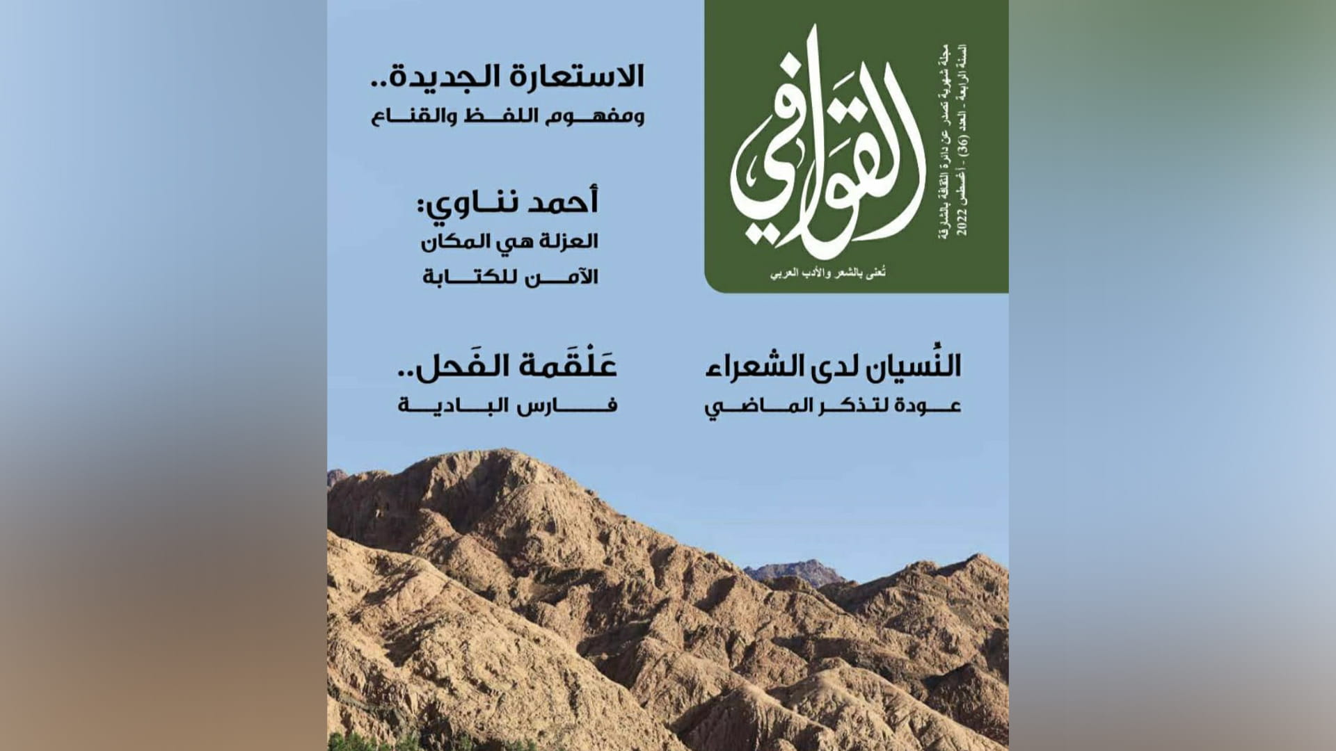 صدر عن بيت الشعر في دائرة الثقافة بالشارقة العدد الـ 36 من مجلة "القوافي" الشهرية، وجاءت افتتاحية المجلة بعنوان "الشعر العربي صفحات مشرقة"، وفيها: الشعر العربي يتّكئ على إنجاز إبداعي متدفق، هو ما يتعيّن علينا تأمّل دلالاته، والنظر بعمق في قدرته على تمثيل الواقع بصيغه اللغوية المبتكرة، وخواصه الأسلوبية المضيئة، وتعدد نماذجه على مدار التاريخ، فقد أفرزت الحياة العربية نصوصاً قيّمة بلورت تعدد التجارب، وهو ما يستدعي تناولها نقدياً، والإضاءة على أصداء هذا الإبداع الشعري الغزير.
