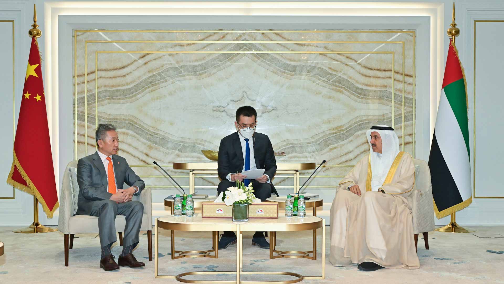 ورحب معالي صقر غباش بسعادة تشانغ ييمينغ- سفير جمهورية الصين الشعبية لدى الدولة، متمنياً له التوفيق والنجاح في مهامه كسفير في دولة الامارات العربية المتحدة.