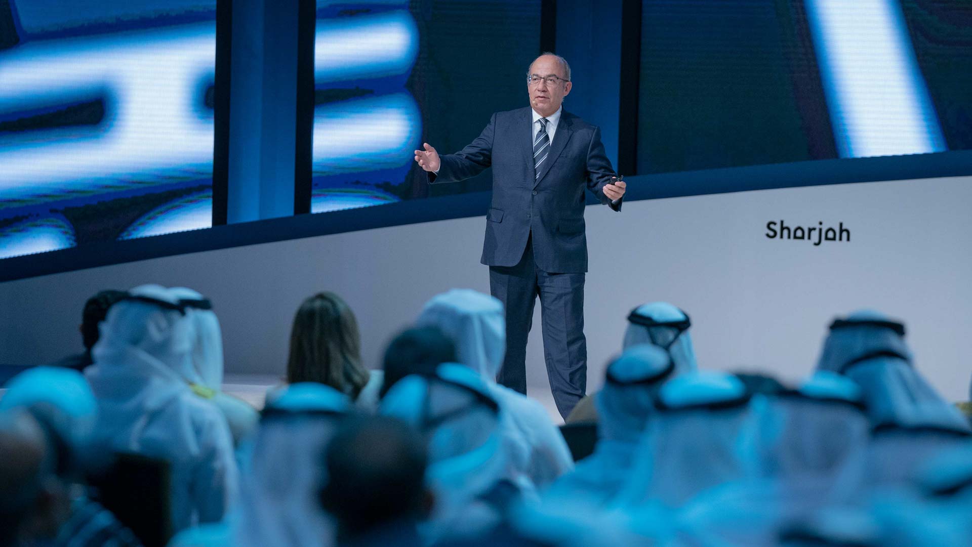 وألقى فيليبي كالديرون، الرئيس المكسيكي الأسبق، الرئيس الفخري للجنة العالمية للاقتصاد والمناخ، خطاباً ملهماً بعنوان "(النمو الأخضر).. آليات اتخاذ القرارات"، تناول فيه أهمية العمل على ضرورة تغيير الطريقة الحالية التي يعالج فيها العالم التغير المناخي من خلال الاتصال الحكومي والطريقة التي نخاطب بها الجمهور.