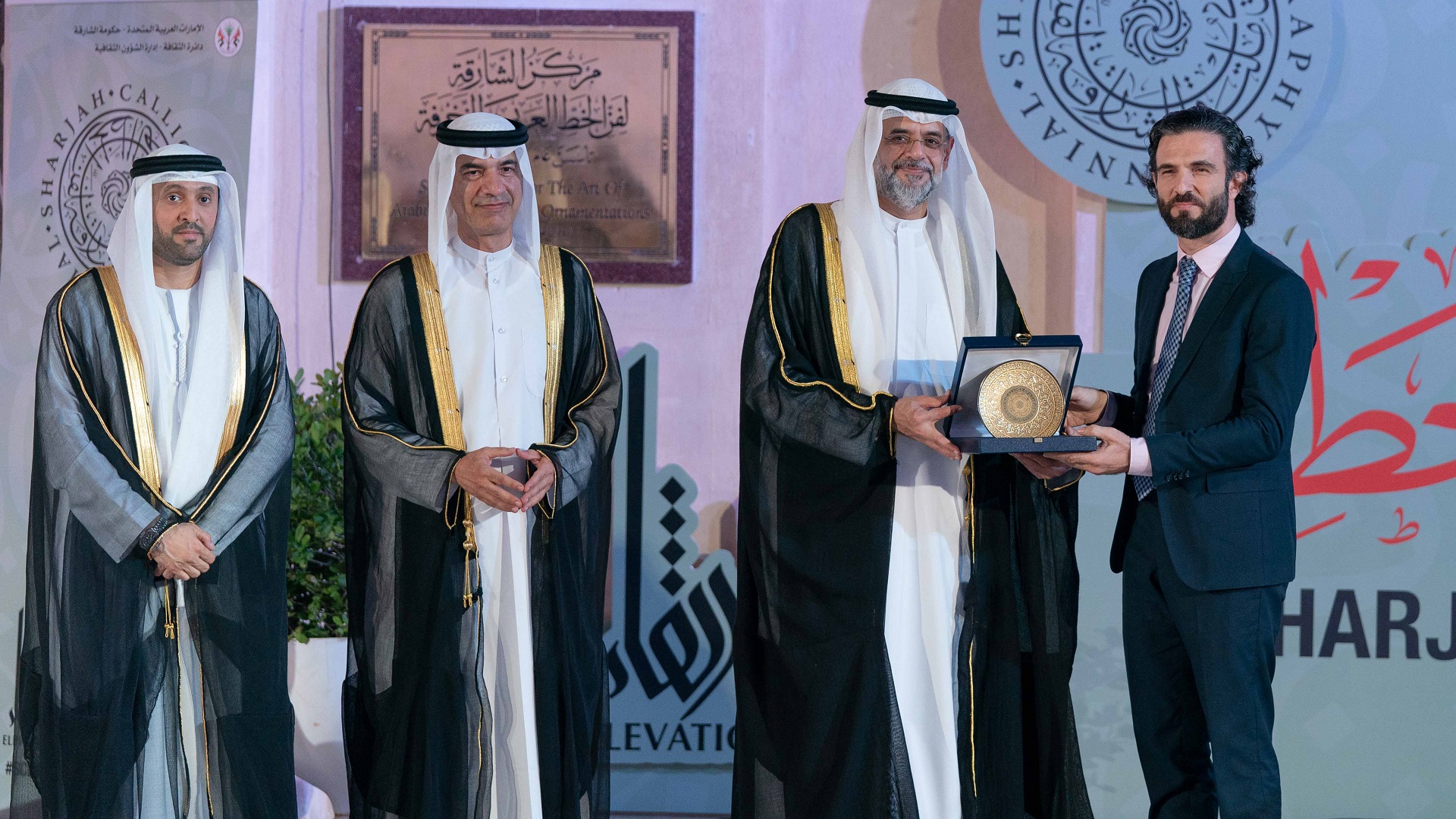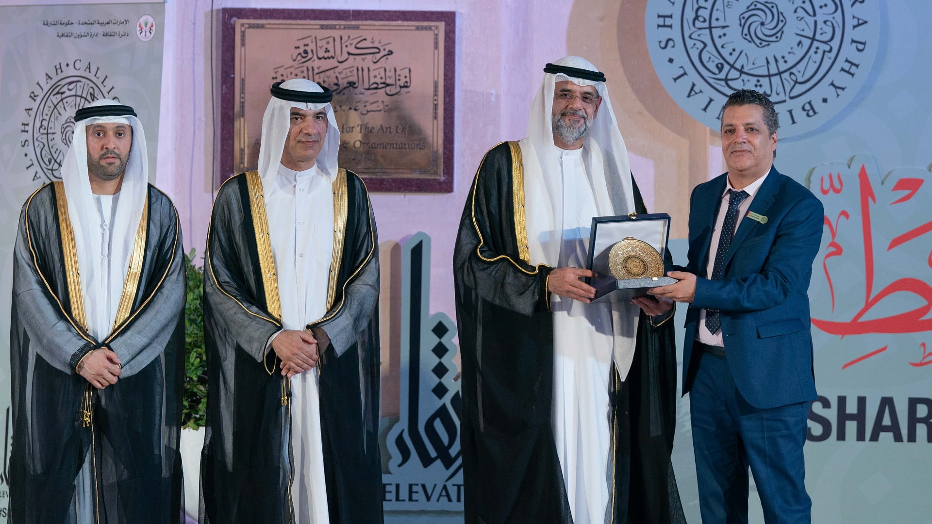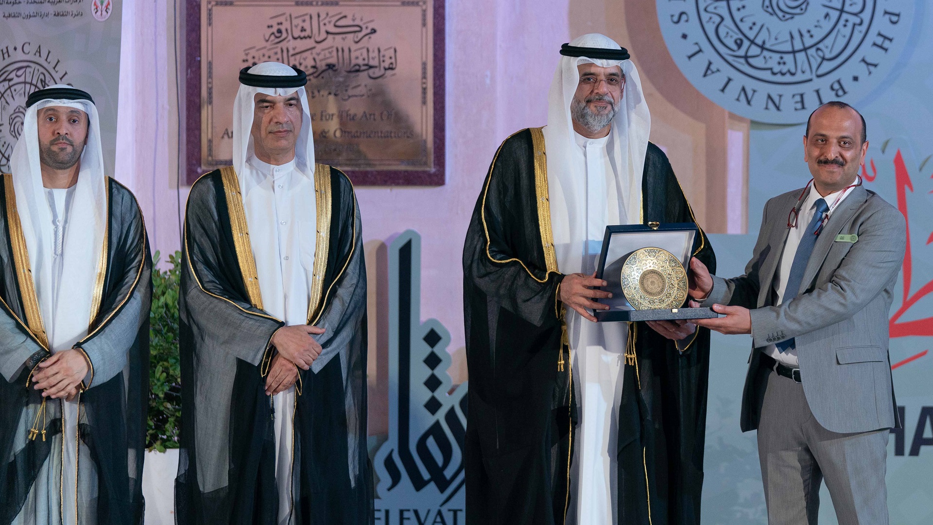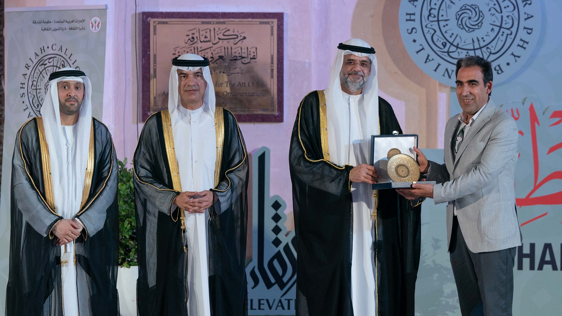 بعدها تفضل سمو ولي العهد نائب حاكم الشارقة، بتكريم عدد من الفنانين من الشخصيات التي قدمت الكثير إلى فن الخط العربي، وهم: معالي عبد الرحمن بن محمد العويس، والفنان حمدي زايد، والخطاط صادق الدوري.