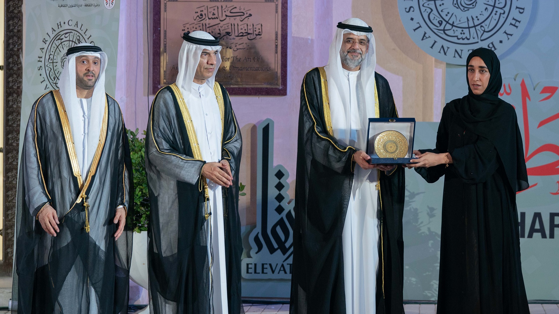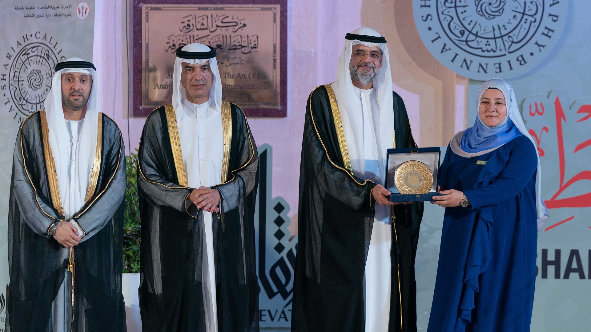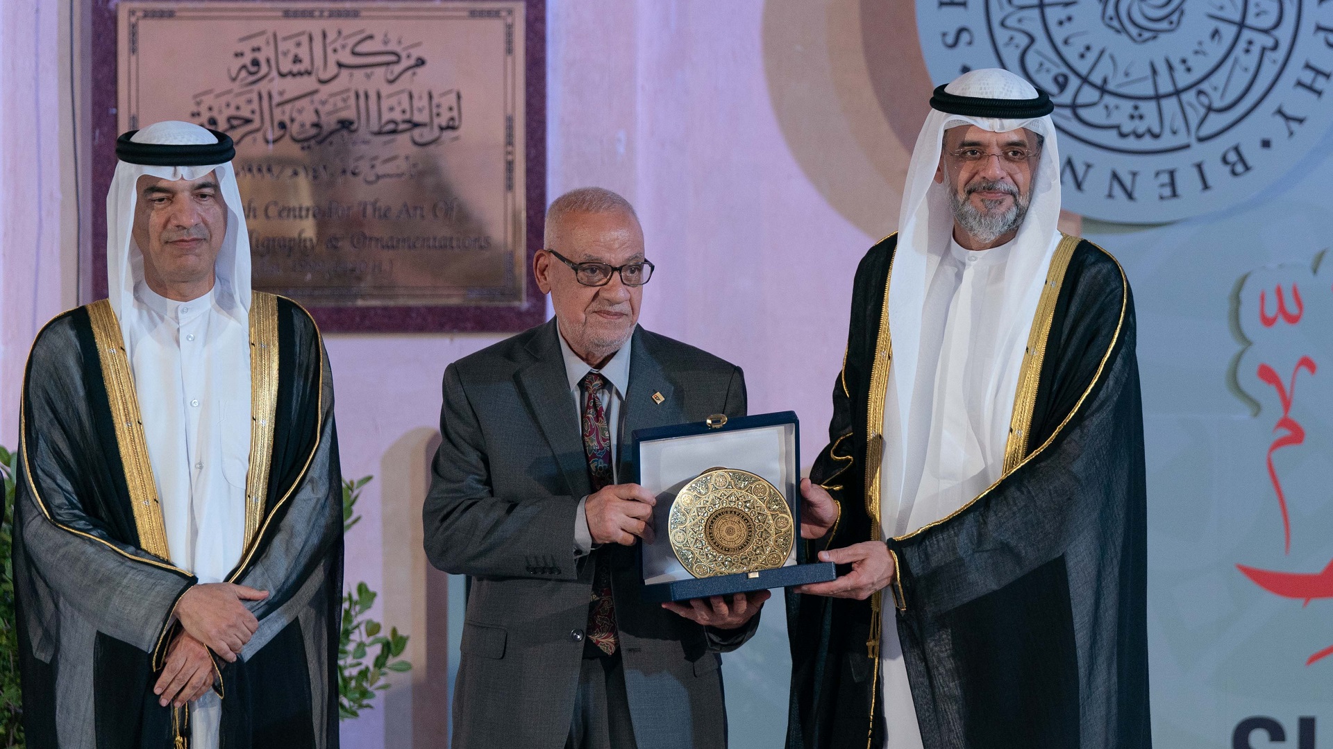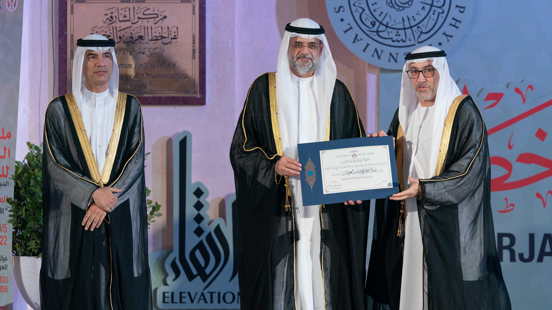 بعدها تفضل سمو ولي العهد نائب حاكم الشارقة، بتكريم عدد من الفنانين من الشخصيات التي قدمت الكثير إلى فن الخط العربي، وهم: معالي عبد الرحمن بن محمد العويس، والفنان حمدي زايد، والخطاط صادق الدوري.