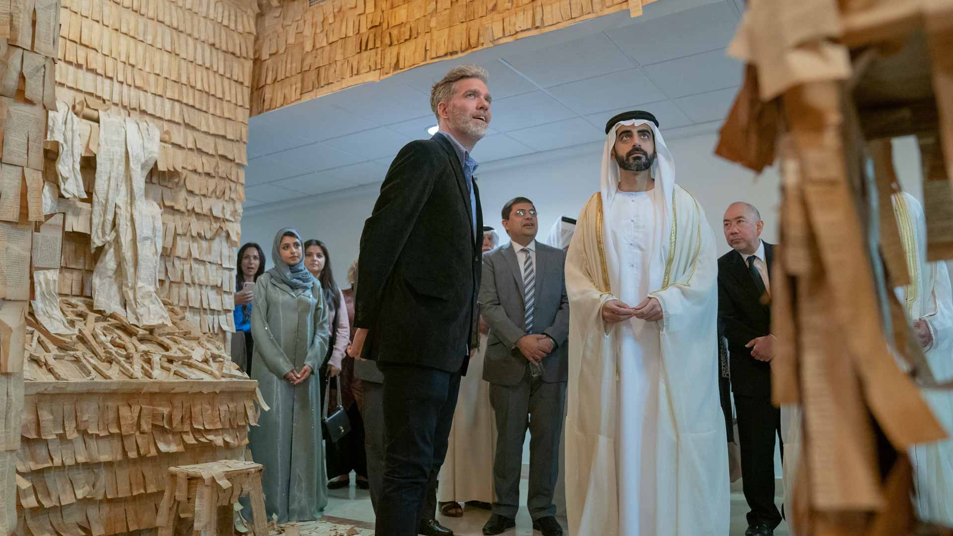 وتوقف رئيس مكتب سمو الحاكم في بداية جولته في المعارض المعاصرة، التي تجمع عدداً من الفنانين من دولة الإمارات العربية المتحدة وغيرها من مختلف دول العالم، وتقدم لوحاتهم المتنوعة من الأعمال التركيبية، والفيديو، واستخدام الخامات المختلفة مثل القماش والخشب والكرتون والخشب المطلي وغيرها.