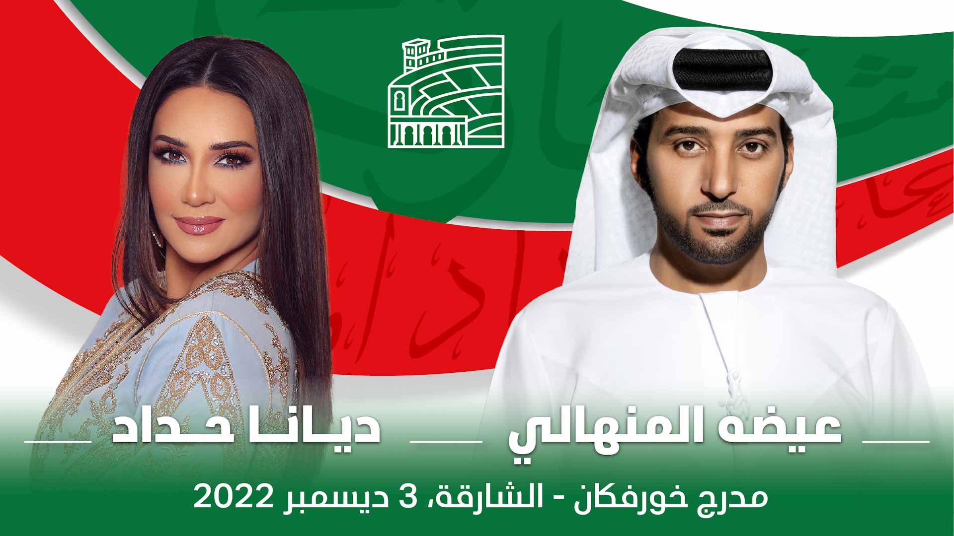 تُنظّم لجنة إمارة الشارقة لاحتفالات عيد الاتحاد، أمسية غنائية على مدرّج خورفكان، في الـ 3 من ديسمبر المقبل، للاحتفال باليوم الوطني الـ 51 لدولة الإمارات العربية المتحدة، وفي هذه المناسبة، يجتمع في المدرّج الفنان عيضة المنهالي والفنانة ديانا حداد ليقدما باقة من أفضل أغانيهما.