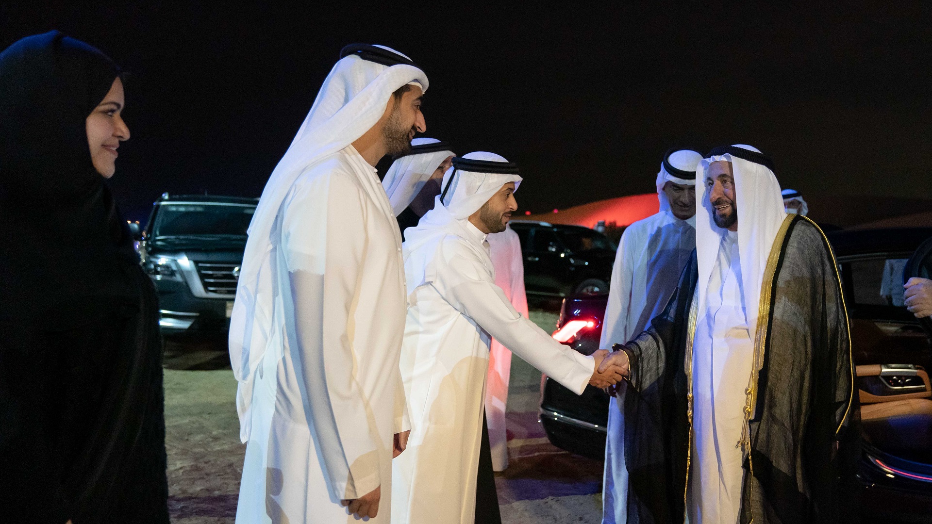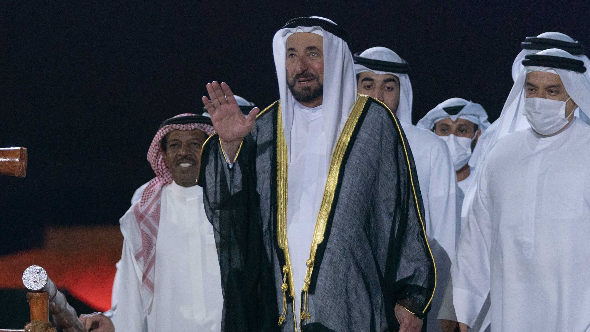وكان في استقبال سموه، لدى وصوله الشيخ محمد بن حميد القاسمي رئيس دائرة الإحصاء والتنمية المجتمعية، والشيخ سعود بن سلطان بن محمد القاسمي مدير مكتب الشارقة الرقمية، وسعادة كل من اللواء سيف الزري الشامسي قائد عام شرطة الشارقة، وعبد الله محمد العويس رئيس دائرة الثقافة، وعلي سالم المدفع رئيس هيئة مطار الشارقة الدولي، ومحمد عبيد الزعابي رئيس دائرة التشريفات والضيافة، والدكتور خالد عمر المدفع رئيس مدينة الشارقة للإعلام، وعدد من المسؤولين وجمع من الفنانين.
