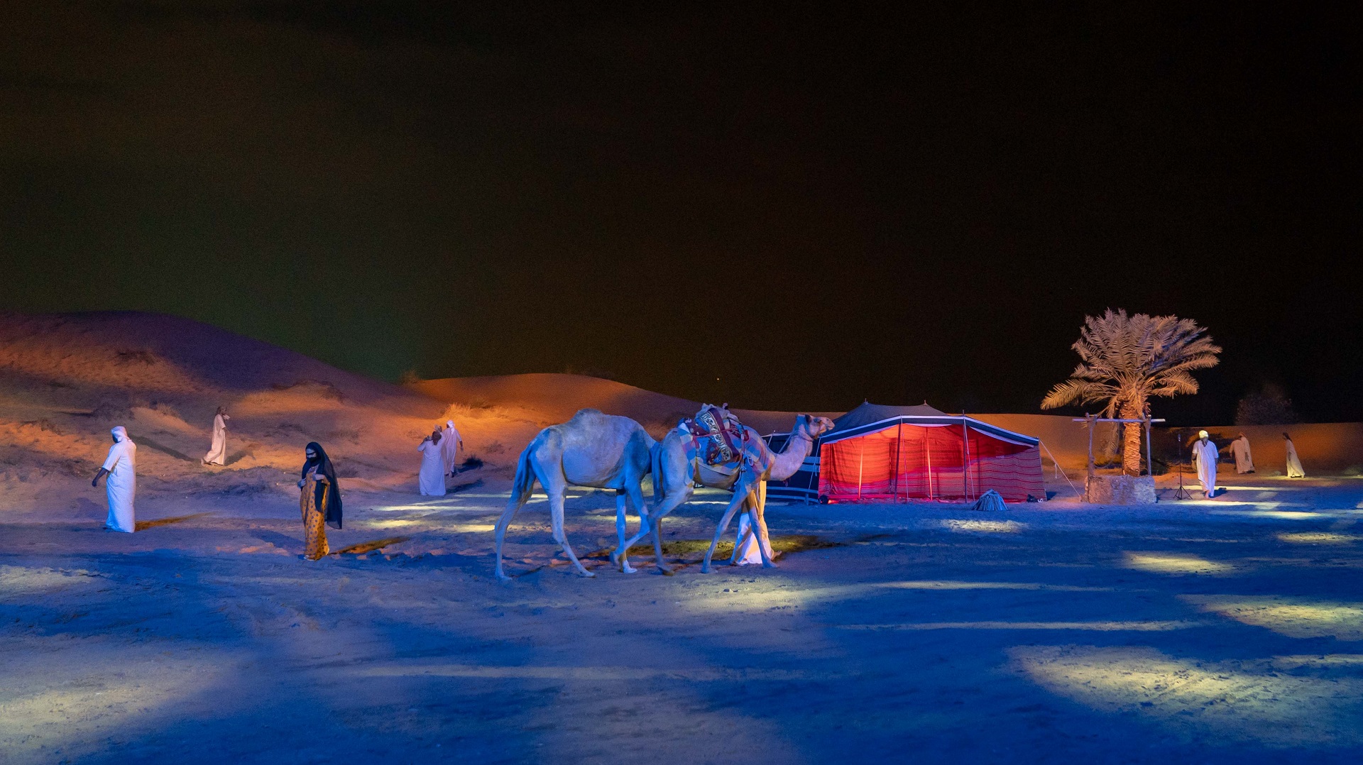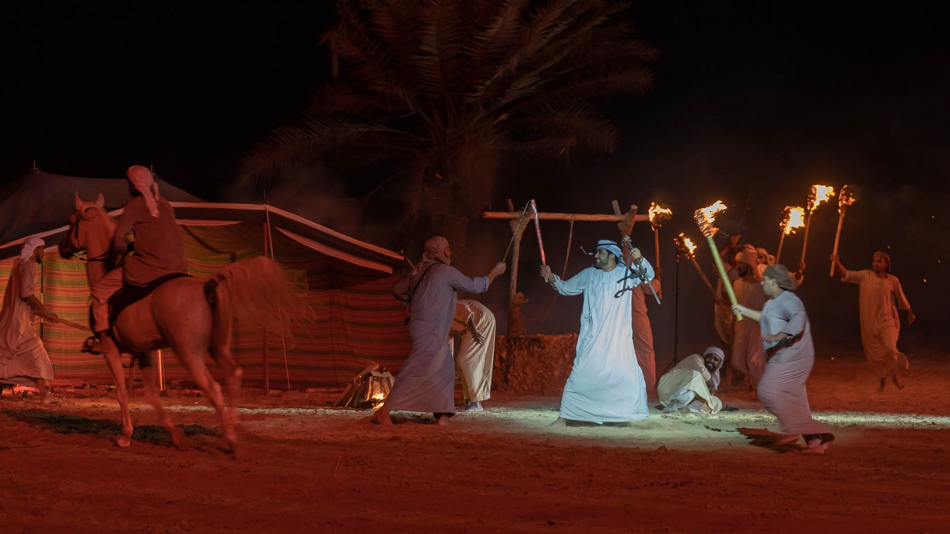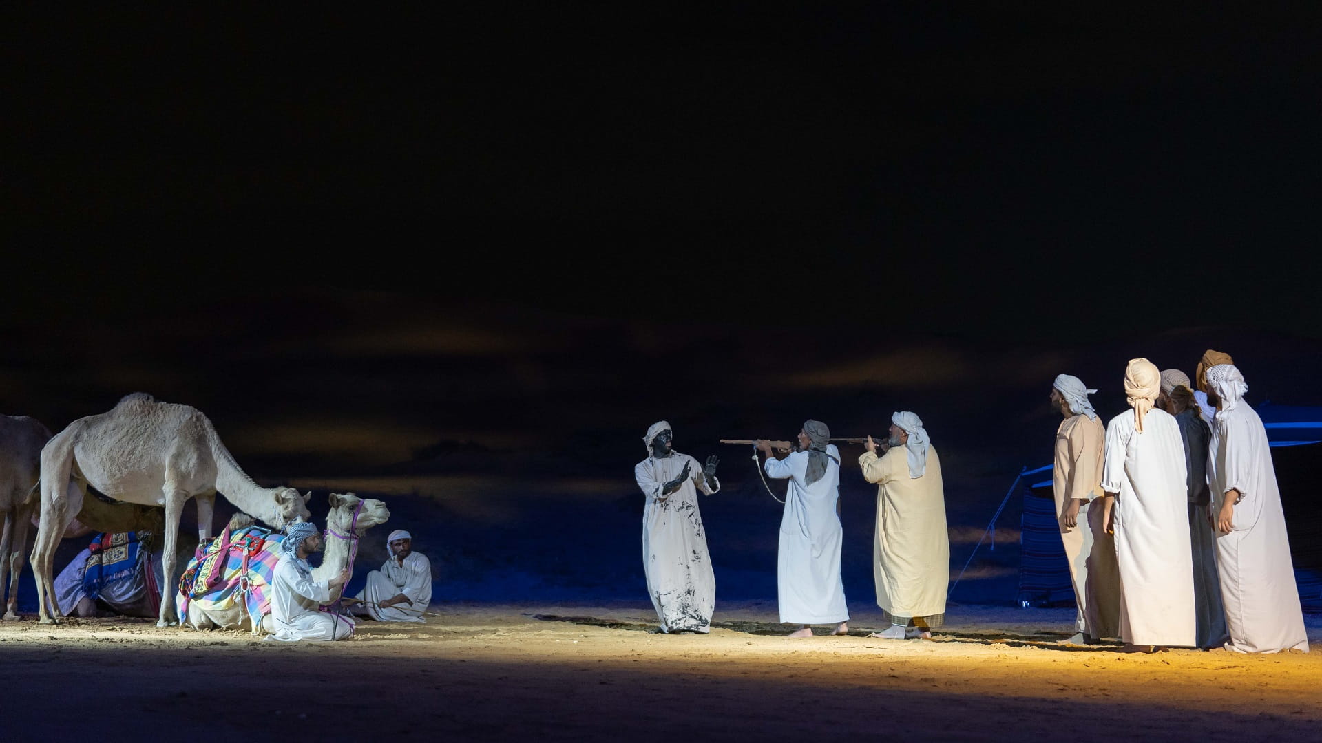 وشمل العرض، العديد من فنون الأداء، منها السرد والشعر والاستعراض ومشاركة الخيول والجمال في المشاهد، إضافة إلى استخدام مجموعة من العناصر أسهمت في توفير فضاء مسرحي مميز أوصل فكرة وأهداف النص للجمهور.